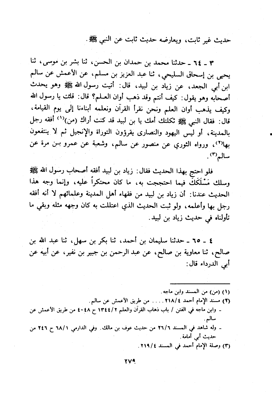 3 - 64 - حَدثنَا مُحَمَّد بن حمدَان بن الْحسن، ثَنَا بشر بن مُوسَى، ثَنَا يحيى بن إِسْحَاق السليحي، ثَنَا عبد الْعَزِيز بن مُسلم، عَن الْأَعْمَش بن سَالم ابْن أبي الْجَعْد، عَن زِيَاد بن لبيد، قَالَ: أتيت رَسُول الله - صَلَّى اللَّهُ عَلَيْهِ وَسَلَّم َ - وَهُوَ يحدث أَصْحَابه وَهُوَ يَقُول: كَيفَ أَنْتُم وَقد ذهب أَوَان الْعلم؟ قَالَ: قلت يَا رَسُول الله وَكَيف يذهب أَوَان الْعلم وَنحن نَقْرَأ الْقُرْآن ونعلمه أنباءنا إِلَى يَوْم الْقِيَامَة، قَالَ: فَقَالَ النَّبِي - صَلَّى اللَّهُ عَلَيْهِ وَسَلَّم َ - ثكلتك أمك يَا بن لبيد قد كنت أَرَاك (من) أفقه رجل بِالْمَدِينَةِ، أَو لَيْسَ الْيَهُود وَالنَّصَارَى يقرؤون التَّوْرَاة وَالْإِنْجِيل ثمَّ لَا يَنْتَفِعُونَ بهَا، وَرَوَاهُ الثَّوْريّ عَن مَنْصُور عَن سَالم، وَشعْبَة عَن عَمْرو بن مرّة عَن سَالم.