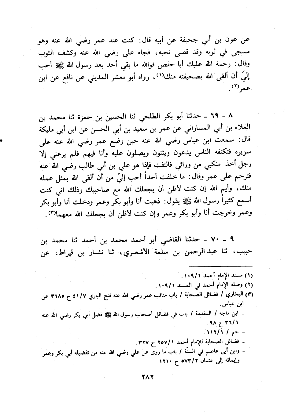 8 - 69 - حَدثنَا أَبُو بكر الطلحي ثَنَا الْحُسَيْن بن حَمْزَة ثَنَا مُحَمَّد بن الْعَلَاء بن أبي المساراني عَن عمر بن سعيد بن أبي الْحسن عَن ابْن أبي مليكَة قَالَ: سَمِعت ابْن عَبَّاس رَضِي الله عَنهُ حِين وضع عمر رَضِي الله عَنهُ على سَرِيره فتكنفه النَّاس يدعونَ ويثنون وَيصلونَ عَلَيْهِ وَأَنا فيهم فَلم يرعني إِلَّا رجل أَخذ مَنْكِبي من ورائي فَالْتَفت فَإِذا هُوَ عَليّ بن أبي طَالب رَضِي الله عَنهُ فترحم على عمر وَقَالَ: مَا خلفت أحدا أحب إِلَيّ من أَن ألْقى الله بِمثل عمله مِنْك، وأيم الله إِن كنت لأَظُن أَن يجعلك الله مَعَ صاحبيك وَذَلِكَ أَنِّي كنت أسمع كثيرا رَسُول الله - صَلَّى اللَّهُ عَلَيْهِ وَسَلَّم َ - يَقُول: ذهبت أَنا وَأَبُو بكر وَعمر وَدخلت أَنا وَأَبُو بكر وَعمر وَخرجت أَنا وَأَبُو بكر وَعمر وَإِن كنت لأَظُن أَن يجعلك الله مَعَهُمَا.