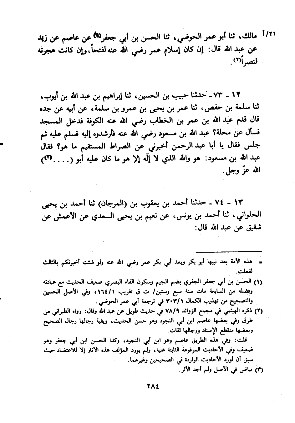 12 - 73 - حَدثنَا حبيب بن الْحُسَيْن، ثَنَا إِبْرَاهِيم بن عبد الله بن أَيُّوب، ثَنَا سَلمَة بن حَفْص، ثَنَا عمر بن يحيى بن عَمْرو بن سَلمَة، عَن أَبِيه عَن جده قَالَ قدم عبد الله بن عمر بن الْخطاب رَضِي الله عَنهُ الْكُوفَة فَدخل الْمَسْجِد فَسَأَلَ عَن محلّة؟ عبد الله بن مَسْعُود رَضِي الله عَنهُ الْكُوفَة فَدخل الْمَسْجِد فَسَأَلَ عَن محلّة؟ عبد الله بن مَسْعُود رَضِي الله عَنهُ فأرشدوه إِلَيْهِ فَسلم عَلَيْهِ ثمَّ جلس فَقَالَ يَا أَبَا عبد الرَّحْمَن أَخْبرنِي عَن الصِّرَاط الْمُسْتَقيم مَا هُوَ؟ فَقَالَ عبد الله بن مَسْعُود: هُوَ وَالله الَّذِي لَا إِلَه إِلَّا هُوَ مَا كَانَ عَلَيْهِ أَبُو ( ... . .) الله عز وَجل.