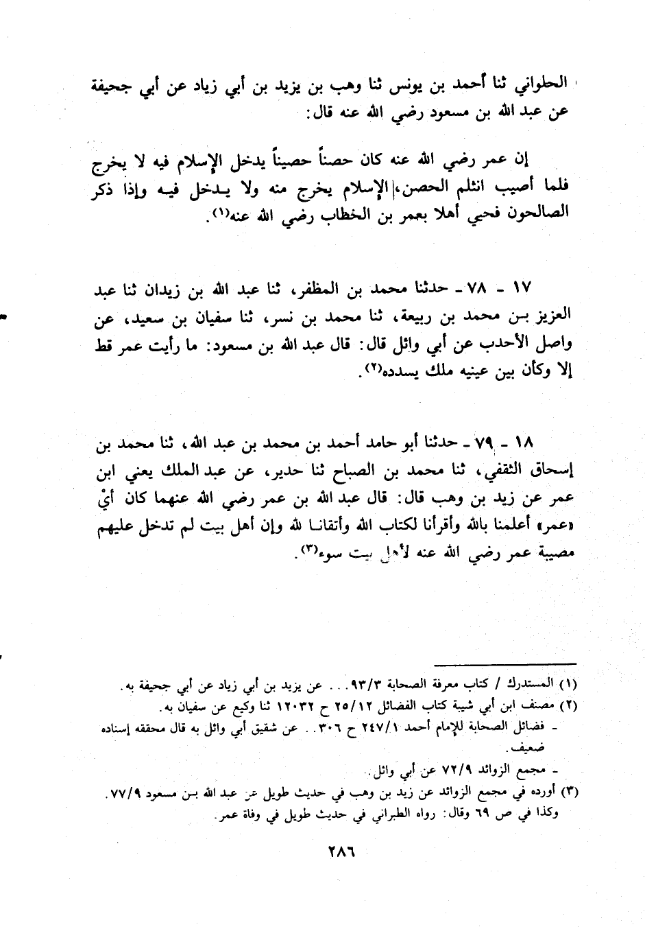 17 - 78 - حَدثنَا مُحَمَّد بن المظفر، ثَنَا عبد الله بن زَيْدَانَ ثَنَا عبد الْعَزِيز بن مُحَمَّد بن ربيعَة، ثَنَا مُحَمَّد بن نسر، ثَنَا سُفْيَان بن سعيد، عَن وَاصل الأحدب عَن أبي وَائِل قَالَ: قَالَ عبد الله بن مَسْعُود: مَا رَأَيْت عمر قطّ إِلَّا وَكَأن بَين عَيْنَيْهِ ملك يسدده.
