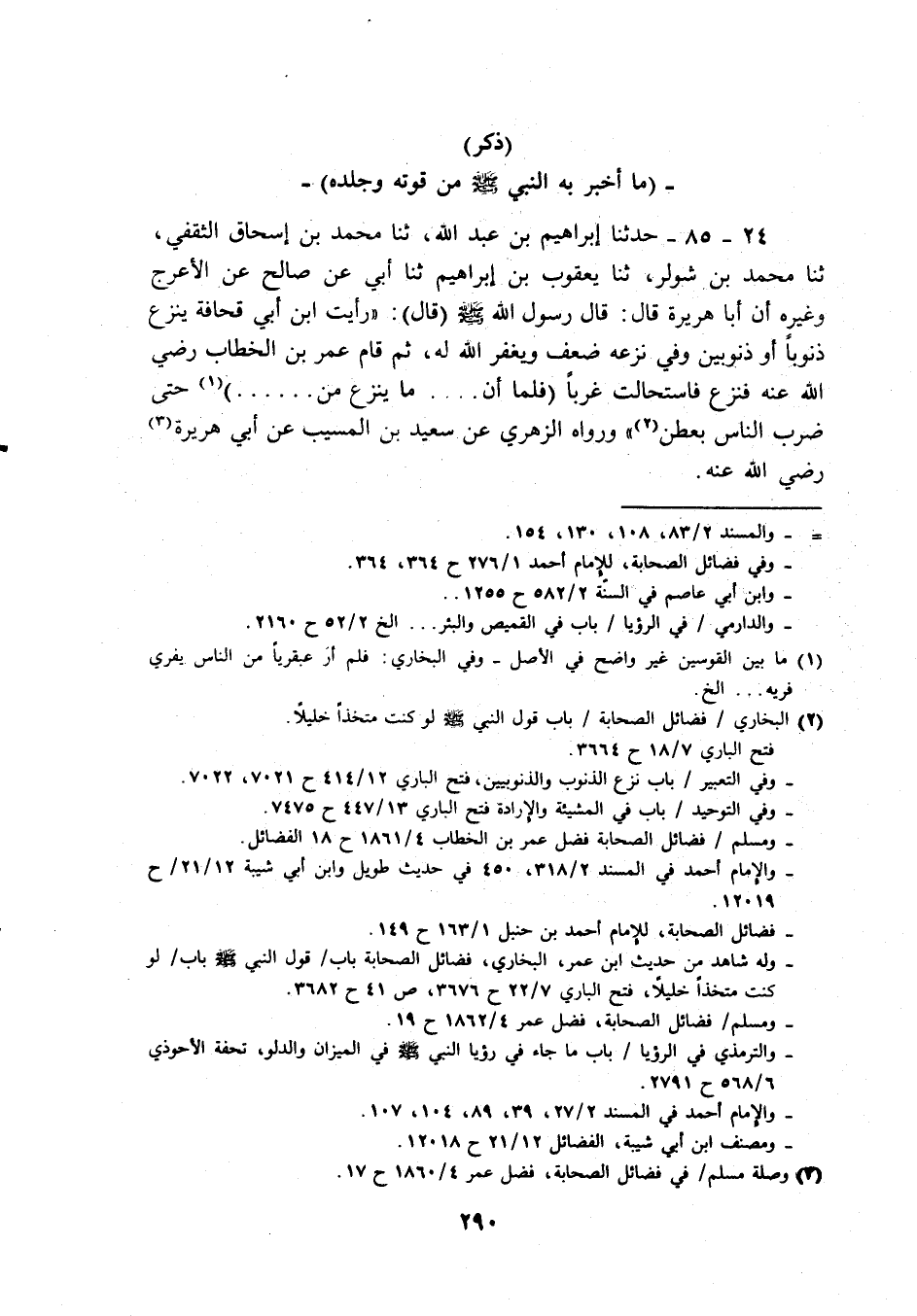 24 - 85 - حَدثنَا إِبْرَاهِيم بن عبد الله، ثَنَا مُحَمَّد بن إِسْحَاق الثَّقَفِيّ، ثَنَا مُحَمَّد بن شولر، ثَنَا يَعْقُوب بن إِبْرَاهِيم ثَنَا أبي عَن صَالح عَن الْأَعْرَج وَغَيره أَن أَبَا هُرَيْرَة قَالَ: قَالَ رَسُول الله - صَلَّى اللَّهُ عَلَيْهِ وَسَلَّم َ - (قَالَ) : " رَأَيْت ابْن أبي قُحَافَة ينْزع ذنوباً أَو ذنوبين وَفِي نَزعه ضعف وَيغْفر الله لَهُ، ثمَّ قَامَ عمر بن الْخطاب رَضِي الله عَنهُ فَنزع فاستحالت غرباً (فَلَمَّا أَن ... مَا ينْزع من) حَتَّى ضرب النَّاس بِعَطَن " وَرَوَاهُ الزُّهْرِيّ عَن سعيد بن الْمسيب عَن أبي هُرَيْرَة رَضِي الله عَنهُ.