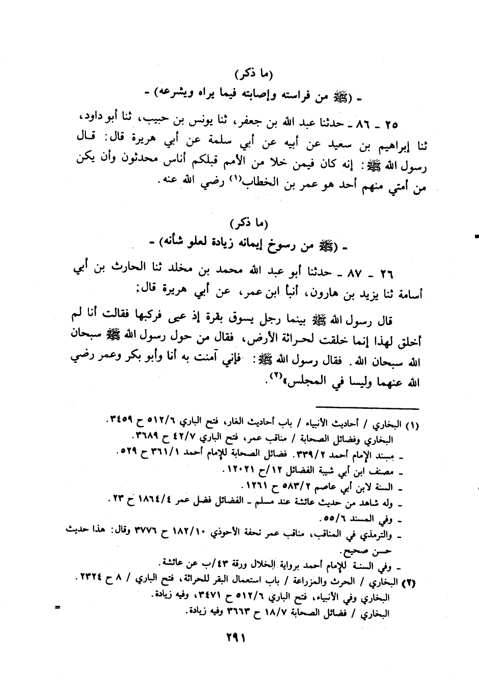 قَالَ رَسُول الله - صَلَّى اللَّهُ عَلَيْهِ وَسَلَّم َ - بَيْنَمَا رجل يَسُوق بقرة إِذْ عيى فركبها فَقَالَت أَنا لم أخلق لهَذَا إِنَّمَا خلقت لحراثة الأَرْض، فَقَالَ من حول رَسُول الله - صَلَّى اللَّهُ عَلَيْهِ وَسَلَّم َ - سُبْحَانَ الله سُبْحَانَ الله. فَقَالَ رَسُول الله - صَلَّى اللَّهُ عَلَيْهِ وَسَلَّم َ -: فَإِنِّي آمَنت بِهِ أَنا وَأَبُو بكر وَعمر رَضِي الله عَنْهُمَا وليسا فِي الْمجْلس ". 26 - 87.