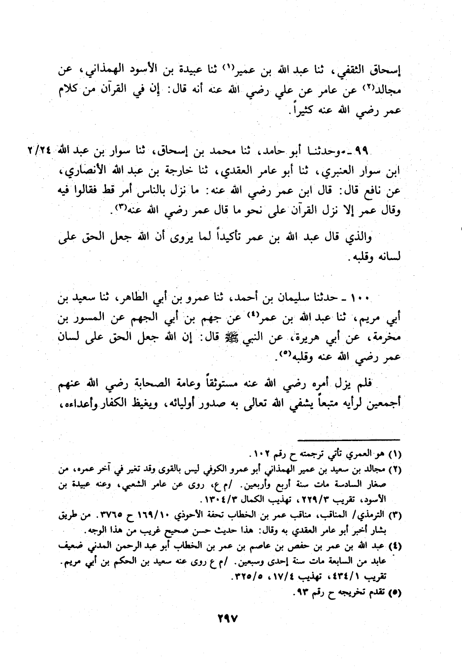 99 - وَحدثنَا أَبُو حَامِد، ثَنَا مُحَمَّد بن إِسْحَاق، ثَنَا سوار بن عبد الله ابْن سوار الْعَنْبَري، ثَنَا أَبُو عَامر الْعَقدي، ثَنَا خَارِجَة بن عبد الله الْأنْصَارِيّ، عَن نَافِع قَالَ: قَالَ ابْن عمر رَضِي الله عَنهُ: مَا نزل بِالنَّاسِ أَمر قطّ فَقَالُوا فِيهِ وَقَالَ عمر إِلَّا نزل الْقُرْآن على نَحْو مَا قَالَ عمر رَضِي الله عَنهُ.