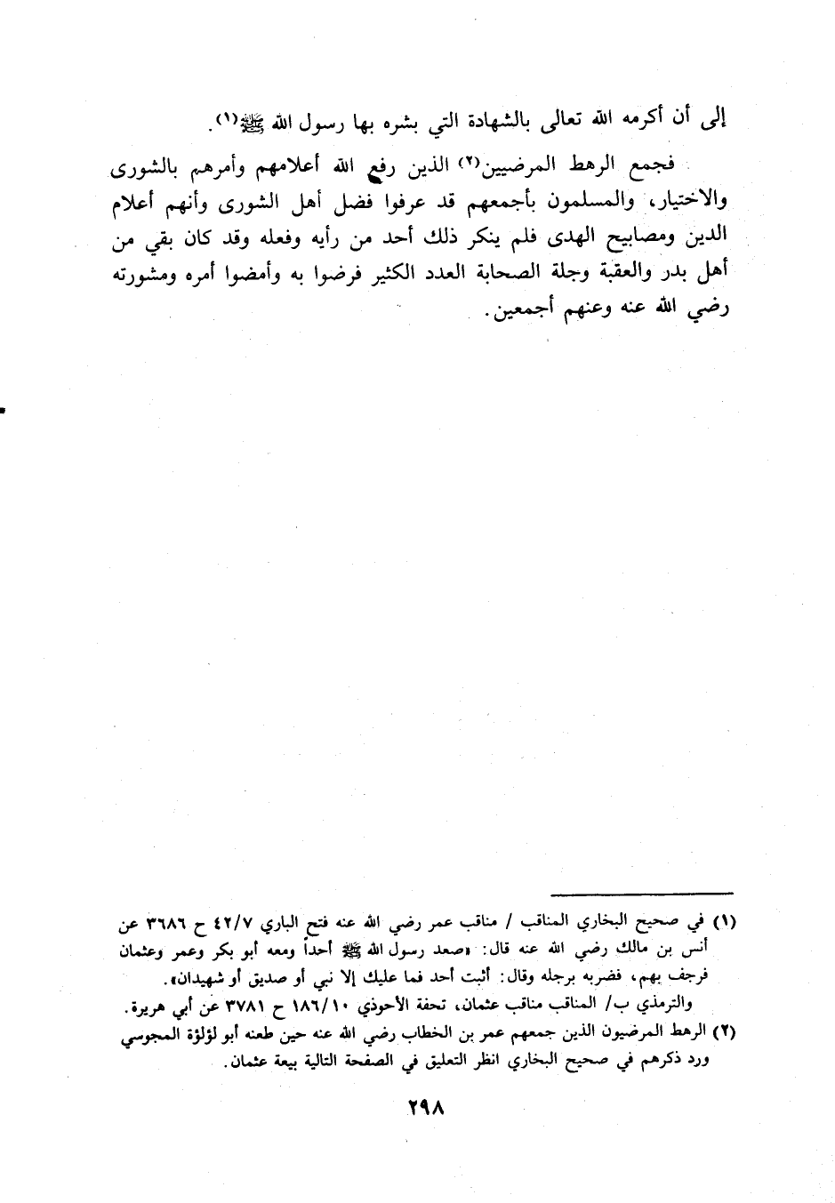 فَجمع الرَّهْط المرضيين الَّذين رفع الله أعلامهم وَأمرهمْ بالشورى وَالِاخْتِيَار، والمسلمون بأجمعهم قد عرفُوا فضل أهل الشورى وَأَنَّهُمْ أَعْلَام الدّين ومصابيح الْهدى فَلم يُنكر ذَلِك أحد من رَأْيه وَفعله وَقد كَانَ بَقِي من أهل بدر والعقبة وَجلة الصَّحَابَة الْعدَد الْكثير فرضوا بِهِ وأمضوا أمره ومشورته رَضِي الله عَنهُ وعنهم أَجْمَعِينَ.