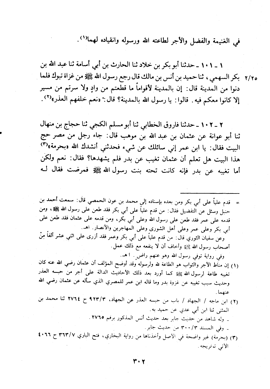 2 - 102 - حَدثنَا فاروق الْخطابِيّ ثَنَا أَبُو مُسلم الْكَجِّي ثَنَا حجاج بن منهال ثَنَا أَبُو عوَانَة عَن عُثْمَان بن عبد الله بن موهب قَالَ: رَجَاء رجل من مصر حج الْبَيْت فَقَالَ: يَا ابْن عمر إِنِّي سَائِلك عَن شَيْء فَحَدثني أنْشدك الله " بِحرْمَة " هَذَا الْبَيْت هَل تعلم أَن عُثْمَان تغيب عَن بدر فَلم يشهدها؟ فَقَالَ: نعم وَلَكِن أما تغيبه عَن بدر فَإِنَّهُ كَانَت تَحْتَهُ بنت رَسُول الله - صَلَّى اللَّهُ عَلَيْهِ وَسَلَّم َ - فمرضت فَقَالَ لَهُ