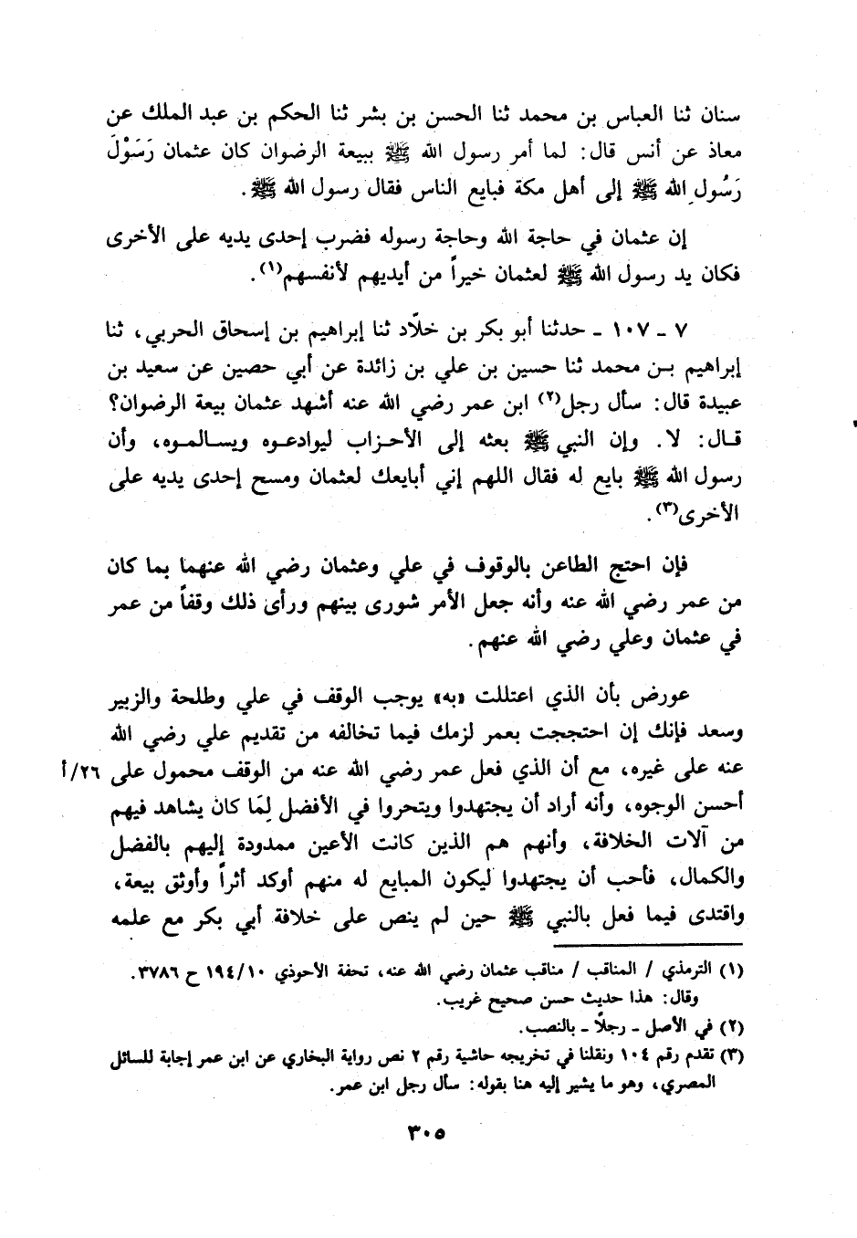 7 - 107 - حَدثنَا أَبُو بكر بن خَلاد ثَنَا إِبْرَاهِيم بن إِسْحَاق الْحَرْبِيّ، ثَنَا إِبْرَاهِيم بن مُحَمَّد ثَنَا حُسَيْن بن عَليّ بن زَائِدَة عَن أبي حُصَيْن عَن سعيد بن عُبَيْدَة قَالَ: سَأَلَ رجل ابْن عمر رَضِي الله عَنهُ أشهد عُثْمَان بيعَة الرضْوَان؟ قَالَ: لَا. وَإِن النَّبِي - صَلَّى اللَّهُ عَلَيْهِ وَسَلَّم َ - بَعثه إِلَى الْأَحْزَاب ليوادعوه ويسالموه، وَأَن رَسُول الله - صَلَّى اللَّهُ عَلَيْهِ وَسَلَّم َ - بَايع لَهُ فَقَالَ اللَّهُمَّ إِنِّي أُبَايِعك لعُثْمَان وَمسح إِحْدَى يَدَيْهِ على الْأُخْرَى.