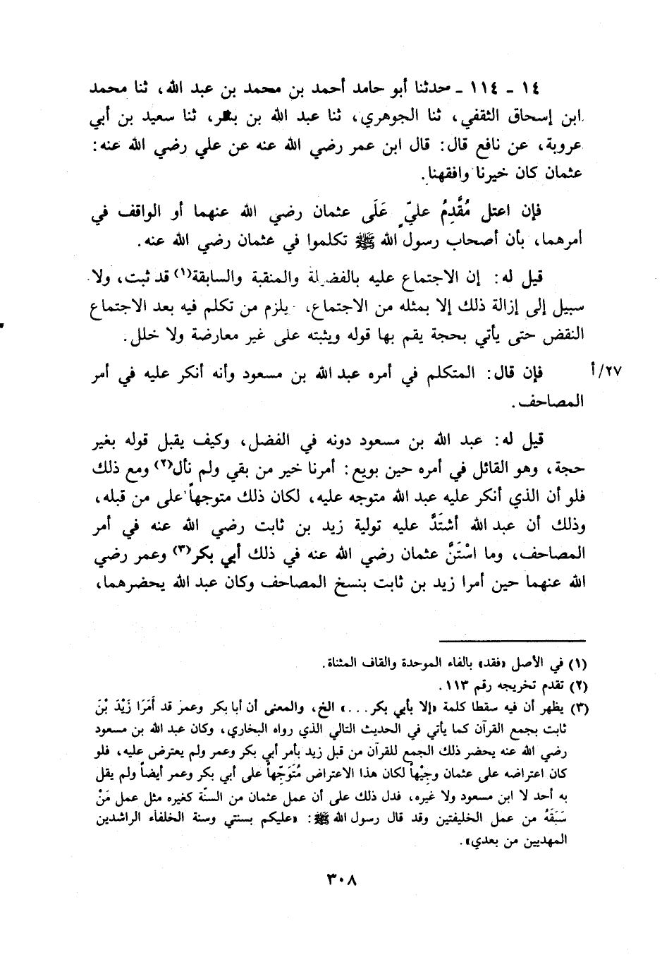 فَإِن اعتل مقدم عَليّ على عُثْمَان رَضِي الله عَنْهُمَا أَو الْوَاقِف فِي امرهما، بِأَن أَصْحَاب رَسُول الله - صَلَّى اللَّهُ عَلَيْهِ وَسَلَّم َ - تكلمُوا فِي عُثْمَان رَضِي الله عَنهُ.