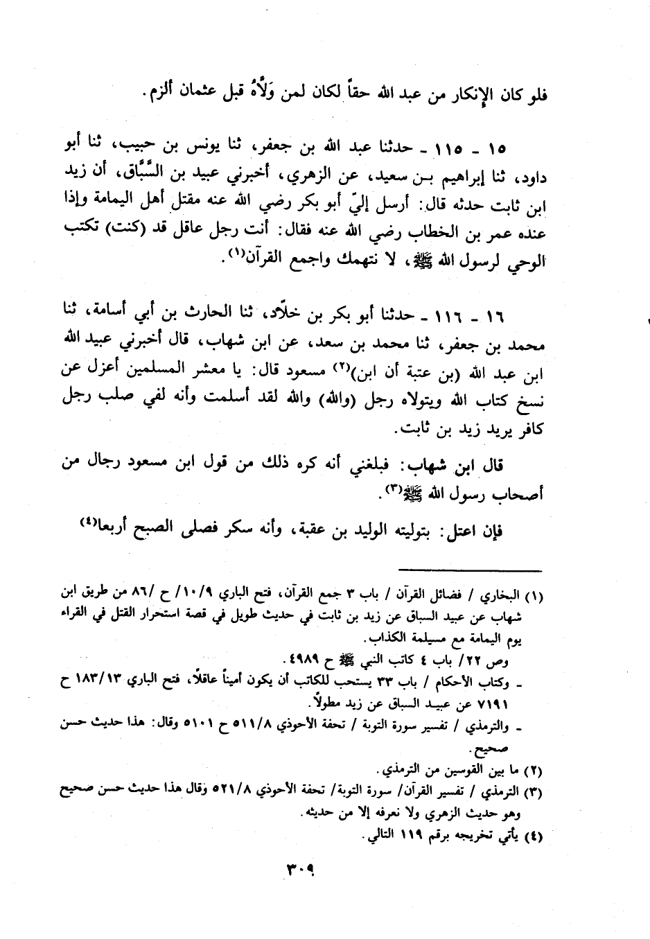 15 - 115 - حَدثنَا عبد الله بن جَعْفَر، ثَنَا يُونُس بن حبيب، ثَنَا أَبُو دَاوُد، ثَنَا إِبْرَاهِيم بن سعيد، عَن الزُّهْرِيّ، أَخْبرنِي عبيد بن السباق، أَن زيد ابْن ثَابت حَدثهُ قَالَ: أرسل إِلَيّ أَبُو بكر رَضِي الله عَنهُ مقتل أهل الْيَمَامَة وَإِذا عِنْده عمر بن الْخطاب رَضِي الله عَنهُ فَقَالَ: أَنْت رجل عَاقل قد (كنت) تكْتب الْوَحْي لرَسُول الله - صَلَّى اللَّهُ عَلَيْهِ وَسَلَّم َ -، لَا نتهمك واجمع الْقُرْآن.