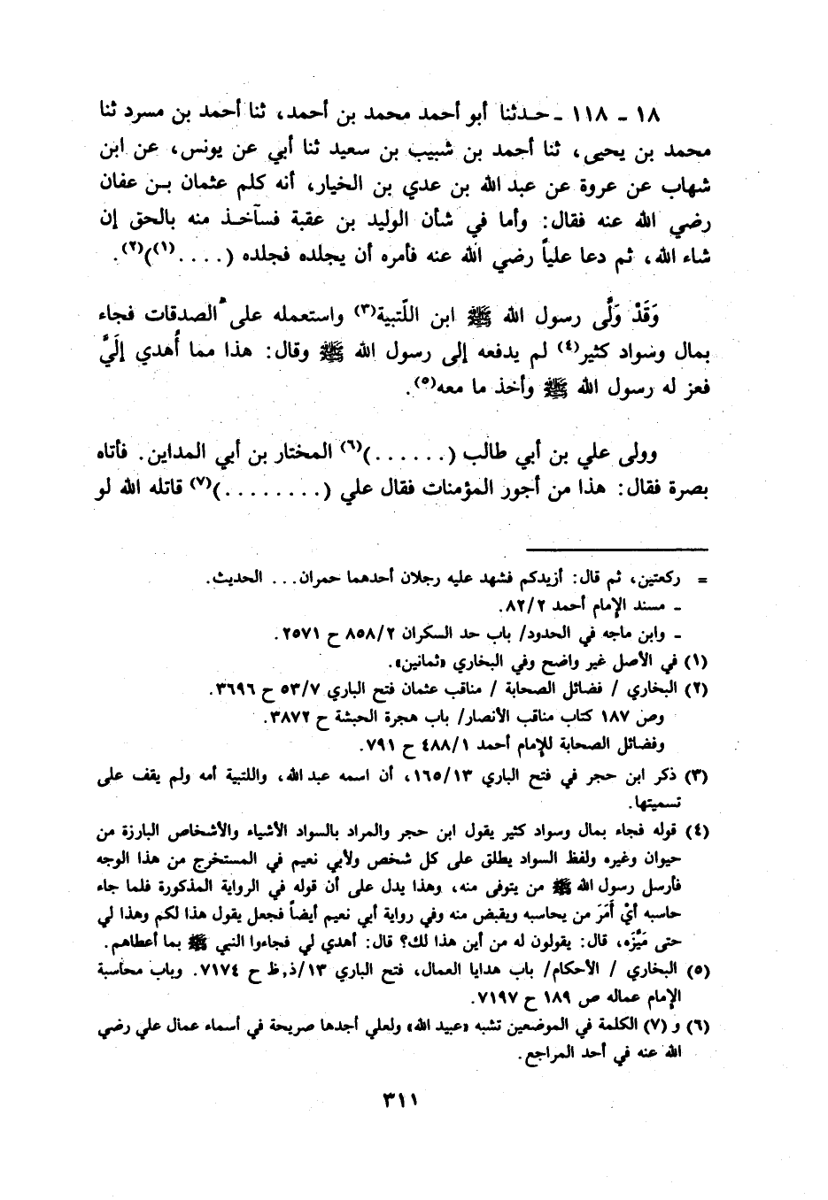 18 - 118 - حَدثنَا أَبُو أَحْمد مُحَمَّد بن أَحْمد، ثَنَا أَحْمد بن مسرد ثَنَا مُحَمَّد بن يحيى، ثَنَا أَحْمد بن شبيب بن سعيد ثَنَا أبي عَن يُونُس، عَن ابْن شهَاب عَن عُرْوَة عَن عبد الله بن عدي بن الْخِيَار، أَنه كلم عُثْمَان بن عَفَّان رَضِي الله عَنهُ فَقَالَ: وَأما فِي شَأْن الْوَلِيد بن عقبَة فسآخذ مِنْهُ بِالْحَقِّ إِن شَاءَ الله، ثمَّ دَعَا عليا رَضِي الله عَنهُ فَأمره أَن يجلده فجلده ( ... .) .