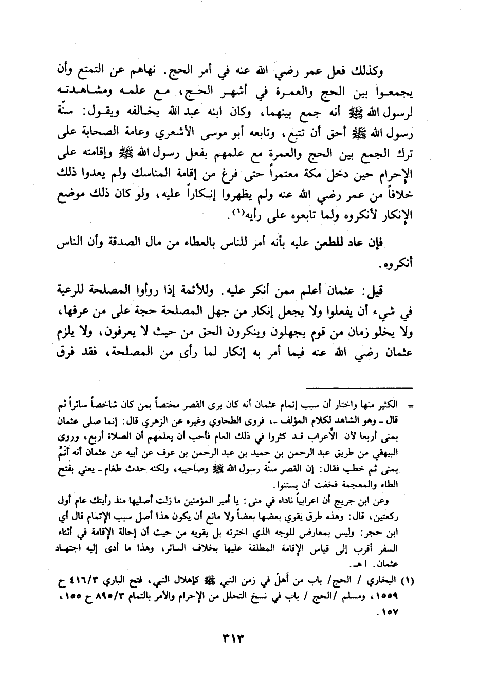 وَكَذَلِكَ فعل عمر رَضِي الله عَنهُ فِي أَمر الْحَج. نَهَاهُم عَن التَّمَتُّع وَأَن يجمعوا بَين الْحَج وَالْعمْرَة فِي أشهر الْحَج، مَعَ علمه ومشاهدته لرَسُول الله - صَلَّى اللَّهُ عَلَيْهِ وَسَلَّم َ - أَنه جمع بَينهمَا، وَكَانَ ابْنه عبد الله يُخَالِفهُ وَيَقُول: سنة رَسُول الله - صَلَّى اللَّهُ عَلَيْهِ وَسَلَّم َ - أَحَق أَن تتبع، وَتَابعه أَبُو مُوسَى الْأَشْعَرِيّ وَعَامة الصَّحَابَة على ترك الْجمع بَين الْحَج وَالْعمْرَة مَعَ علمهمْ بِفعل رَسُول الله - صَلَّى اللَّهُ عَلَيْهِ وَسَلَّم َ - وإقامته على الْإِحْرَام حِين دخل مَكَّة مُعْتَمِرًا حَتَّى فرغ من إِقَامَة الْمَنَاسِك وَلم يعدوا ذَلِك خلافًا من عمر رَضِي الله عَنهُ وَلم يظهروا إنكاراً عَلَيْهِ، وَلَو كَانَ ذَلِك مَوضِع الْإِنْكَار لأنكروه وَلما تابعوه على رَأْيه.