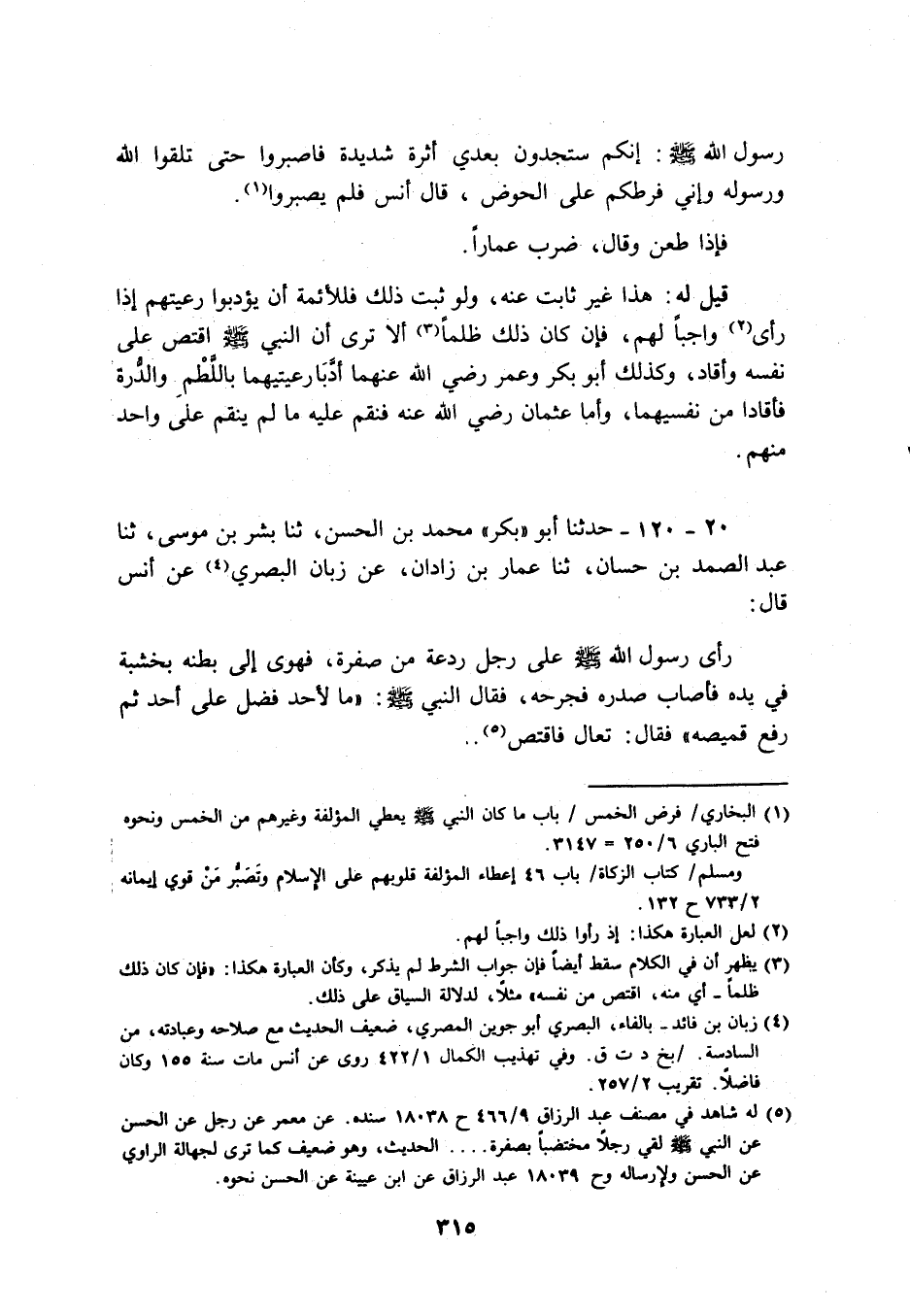 قيل لَهُ: هَذَا غير ثَابت عَنهُ، وَلَو ثَبت ذَلِك فللأئمة أَن يؤدبوا رعيتهم إِذا رأى وَاجِبا لَهُم، فَإِن كَانَ ذَلِك ظلما أَلا ترى أَن النَّبِي - صَلَّى اللَّهُ عَلَيْهِ وَسَلَّم َ - اقْتصّ على نَفسه وأقاد، وَكَذَلِكَ أَبُو بكر وَعمر رَضِي الله عَنْهُمَا أدبارعيتيهما باللطم والدرة فأقادا من نفسيهما، وَأما عُثْمَان رَضِي الله عَنهُ فنقم عَلَيْهِ مَا لم ينقم على وَاحِد مِنْهُم.