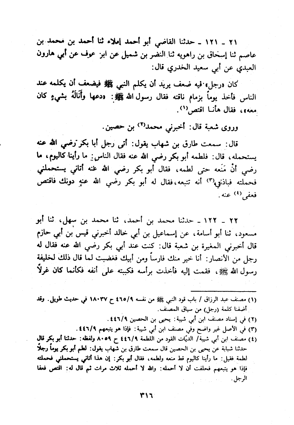قَالَ: سَمِعت طَارق بن شهَاب يَقُول: أَتَى رجل أَبَا بكر رَضِي الله عَنهُ يستحمله، قَالَ: فَلَطَمَهُ أَبُو بكر رَضِي الله عَنهُ فَقَالَ النَّاس: مَا رَأينَا كَالْيَوْمِ، مَا رَضِي أَن مَنعه حَتَّى لطمه، فَقَالَ أَبُو بكر رَضِي الله عَنهُ أَتَانِي يستحملني فَحَملته فباذني أَنه تتبعه، فَقَالَ لَهُ أَبُو بكر رَضِي الله عَنهُ دُونك فاقتص فعفى عَنهُ.