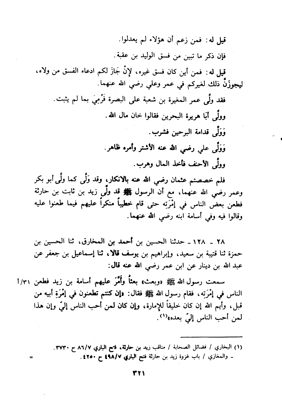فَلم خصصتم عُثْمَان رَضِي الله عَنهُ بالإنكار، وَقد ولى كَمَا ولى أَبُو بكر وَعمر رَضِي الله عَنْهُمَا، مَعَ أَن رَسُول الله - صَلَّى اللَّهُ عَلَيْهِ وَسَلَّم َ - قد ولى زيد بن ثَابت بن حَارِثَة فطعن بعض النَّاس فِي إمرته حَتَّى قَامَ خَطِيبًا مُنْكرا عَلَيْهِم فِيمَا طعنوا عَلَيْهِ وَقَالُوا فِيهِ وَفِي أُسَامَة ابْنه رَضِي الله عَنْهُمَا.