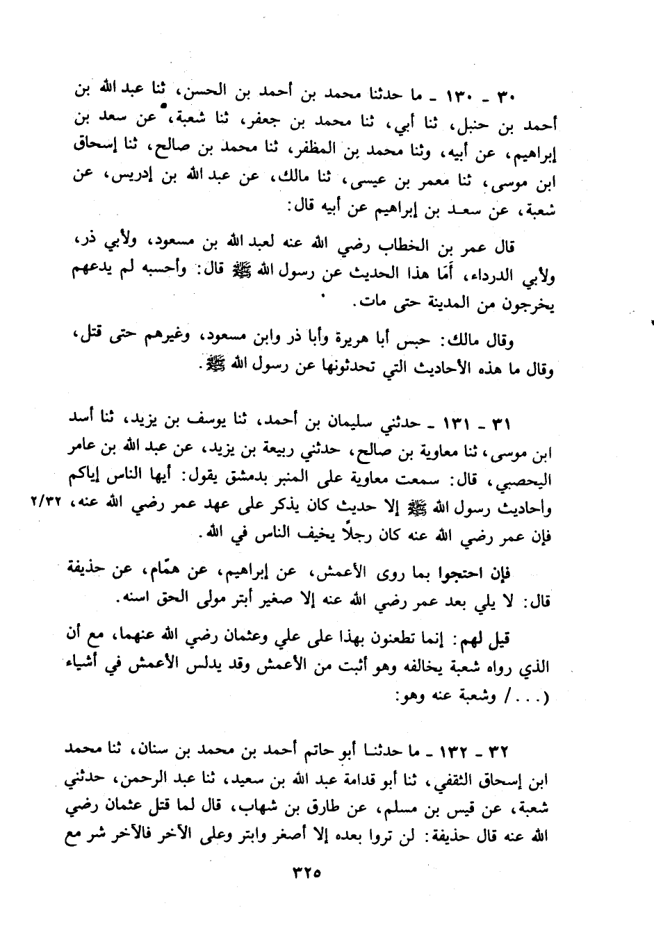 30 - 130 - مَا حَدثنَا مُحَمَّد بن أَحْمد بن الْحسن، ثَنَا عبد الله بن أَحْمد بن حَنْبَل، ثَنَا أبي، ثَنَا مُحَمَّد بن جَعْفَر، ثَنَا شُعْبَة، عَن سعد بن إِبْرَاهِيم، عَن أَبِيه، وثنا مُحَمَّد بن المظفر، ثَنَا مُحَمَّد بن صَالح، ثَنَا إِسْحَاق ابْن مُوسَى، ثَنَا معمر بن عِيسَى، ثَنَا مَالك، عَن عبد الله بن إِدْرِيس، عَن شُعْبَة، عَن سعد بن إِبْرَاهِيم عَن أَبِيه قَالَ: