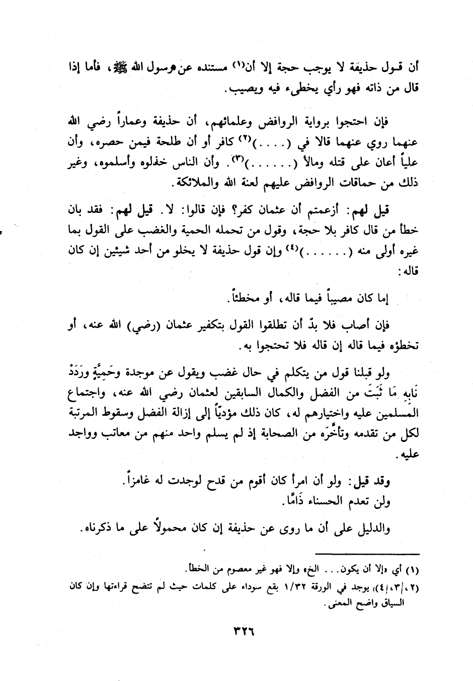 قيل لَهُم: أزعمتم أَن عُثْمَان كفر؟ فَإِن قَالُوا: لَا، قيل لَهُم: فقد بَان خطأ من قَالَ كَافِر بِلَا حجَّة، وَقَول من تحمله الحمية وَالْغَضَب على القَوْل بِمَا غَيره أولى مِنْهُ ( ... ) وَإِن قَول حُذَيْفَة لَا يَخْلُو من أحد شَيْئَيْنِ إِن كَانَ قَالَه: