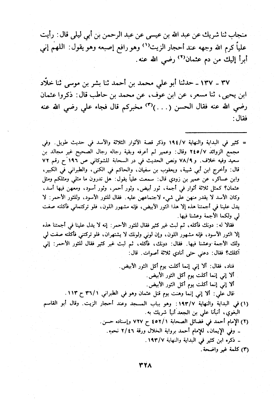 منْجَاب ثَنَا شريك عَن عبد الله بن عِيسَى عَن عبد الرَّحْمَن بن أبي ليلى قَالَ: رَأَيْت عليا كرم الله وَجهه عِنْد أَحْجَار الزَّيْت وَهُوَ رَافع إصبعه وَهُوَ يَقُول: اللَّهُمَّ إِنِّي أَبْرَأ إِلَيْك من دم عُثْمَان رَضِي الله عَنهُ.
