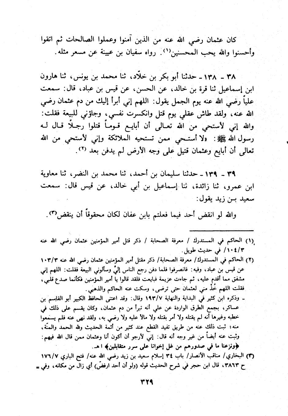 38 - 138 - حَدثنَا أَبُو بكر بن خَلاد، ثَنَا مُحَمَّد بن يُونُس، ثَنَا هَارُون ابْن إِسْمَاعِيل ثَنَا قُرَّة بن خَالِد، عَن الْحسن، عَن قيس بن عباد، قَالَ: سَمِعت عليا رَضِي الله عَنهُ يَوْم الْجمل يَقُول: اللَّهُمَّ إِنِّي أَبْرَأ إِلَيْك من دم عُثْمَان رَضِي الله عَنهُ، وَلَقَد طاش عَقْلِي يَوْم قتل وانكسرت نَفسِي، وجاؤني لِلْبيعَةِ فَقلت: وَالله إِنِّي لأَسْتَحي من الله تَعَالَى أَن أبايع قوما قتلوا رجلا قَالَ لَهُ رَسُول الله - صَلَّى اللَّهُ عَلَيْهِ وَسَلَّم َ -: " لَا أستحي مِمَّن تستحيه الْمَلَائِكَة وَإِنِّي لأَسْتَحي من الله تَعَالَى أَن أبايع وَعُثْمَان قَتِيل على وَجه الأَرْض لم يدْفن بعد.
