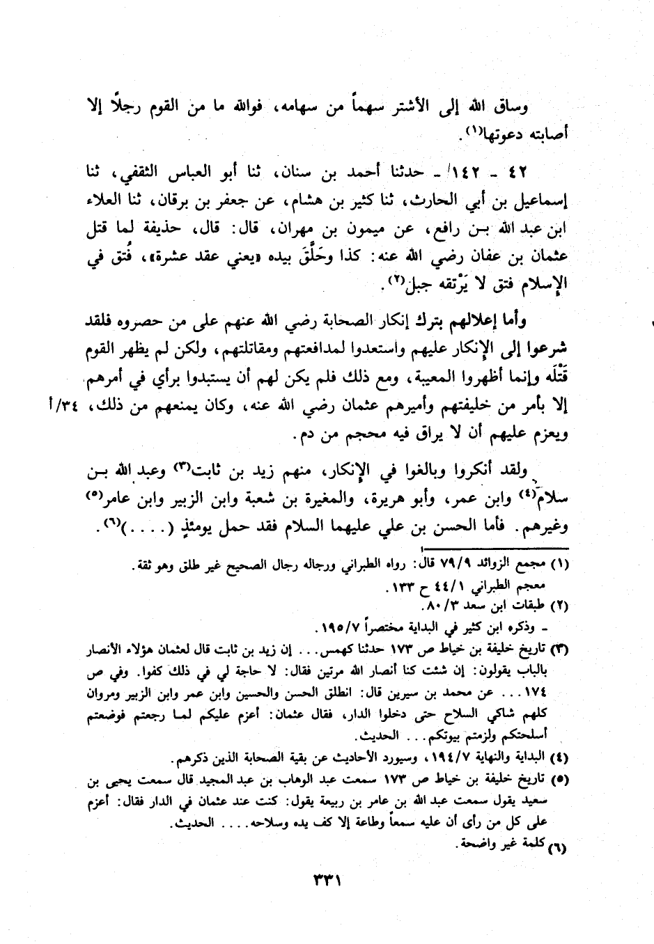وَأما إعلالهم بترك إِنْكَار الصَّحَابَة رَضِي الله عَنْهُم على من حصروه فَلَقَد شرعوا إِلَى الْإِنْكَار عَلَيْهِم واستعدوا لمدافعتهم ومقاتلتهم، وَلَكِن لم يظْهر الْقَوْم قَتله وَإِنَّمَا أظهرُوا المعيبة، وَمَعَ ذَلِك فَلم يكن لَهُم أَن يستبدلوا بِرَأْي فِي أَمرهم إِلَّا بِأَمْر من خليفتهم وأميرهم عُثْمَان رَضِي الله عَنهُ، وَكَانَ يمنعهُم من ذَلِك، ويعزم عَلَيْهِم أَن لَا يراق فِيهِ محجم من دم.