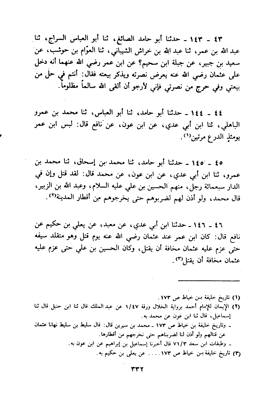 43 - 143 - حَدثنَا أَبُو حَامِد الصَّائِغ، ثَنَا أَبُو الْعَبَّاس السراج، ثَنَا عبد الله بن عمر، ثَنَا عبد الله بن خرَاش الشَّيْبَانِيّ، ثَنَا الْعَوام بن حَوْشَب، عَن سعيد بن جُبَير، عَن جبلة ابْن سحيم؟ عَن ابْن عمر رَضِي الله عَنْهُمَا أَنه دخل على عُثْمَان رَضِي الله عَنهُ يعرض نصرته وَيذكر بيعَته فَقَالَ: أَنْتُم فِي حل من بيعتي وَفِي حرج من نصرتي فَإِنِّي لأرجو أَن ألْقى الله سالما مَظْلُوما.