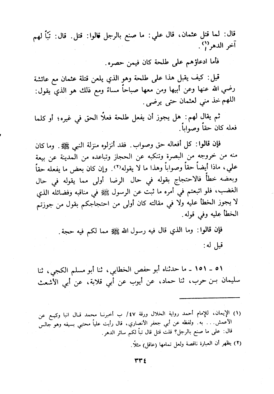 51 - 151 - مَا حدّثنَاهُ أَبُو حَفْص الْخطابِيّ، ثَنَا أَبُو مُسلم الْكَجِّي، ثَنَا سُلَيْمَان بن حَرْب، ثَنَا حَمَّاد، عَن أَيُّوب عَن أبي قلَابَة، عَن أبي الْأَشْعَث