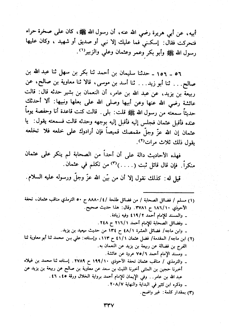 فَهَذِهِ الْأَحَادِيث دَالَّة على أَن أحدا من الصَّحَابَة لم يُنكر على عُثْمَان مُنْكرا. فَإِن قَالَ قَائِل ثَبت ( ... .) من تكلم فِي عُثْمَان.