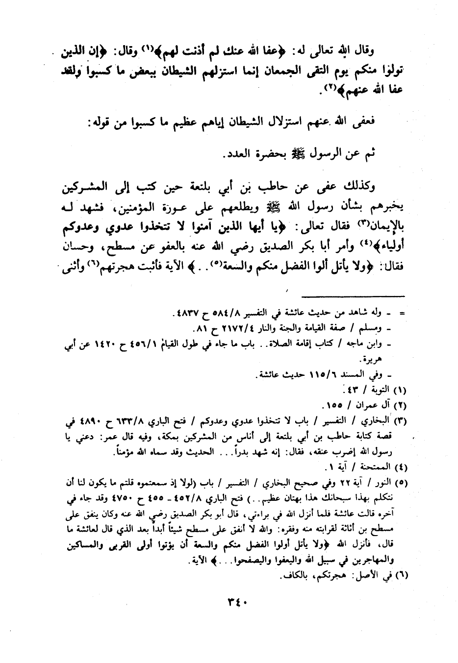 وَكَذَلِكَ عفى عَن حَاطِب بن أبي بلتعة حِين كتب إِلَى الْمُشْركين يُخْبِرهُمْ بشأن رَسُول الله - صَلَّى اللَّهُ عَلَيْهِ وَسَلَّم َ - ويطلعهم على عَورَة الْمُؤمنِينَ، فَشهد لَهُ بِالْإِيمَان فَقَالَ تَعَالَى: {يَا أَيهَا الَّذين آمنُوا لَا تَتَّخِذُوا عدوي وَعَدُوكُمْ أَوْلِيَاء} وَأمر أَبَا بكر الصّديق رَضِي الله عَنهُ بِالْعَفو عَن مسطح، وَحسان فَقَالَ: {وَلَا يَأْتَلِ ألوا الْفضل مِنْكُم وَالسعَة. .} الْآيَة فَأثْبت هجرتهم وَأثْنى