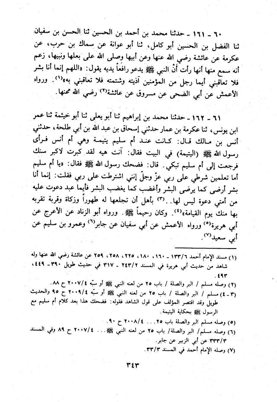 61 - 162 - حَدثنَا مُحَمَّد بن إِبْرَاهِيم ثَنَا أَبُو يعلى ثَنَا أَبُو خَيْثَمَة ثَنَا عمر ابْن يُونُس، ثَنَا عِكْرِمَة بن عمار حَدثنِي إِسْحَاق بن عبد الله بن أبي طَلْحَة، حَدثنِي أنس بن مَالك قَالَ: كَانَت عِنْد أم سليم يتيمة وَهِي أم أنس فَرَأى رَسُول الله - صَلَّى اللَّهُ عَلَيْهِ وَسَلَّم َ - (الْيَتِيمَة) فِي الْبَيْت فَقَالَ: آنت هيه لقد كَبرت لاكبر سنك فَرَجَعت إِلَى أم سليم تبْكي. قَالَ: فَضَحِك رَسُول الله - صَلَّى اللَّهُ عَلَيْهِ وَسَلَّم َ - فَقَالَ: " يَا أم سليم أما تعلمين شرطي على رَبِّي عز وَجل إِنَّنِي اشْترطت على رَبِّي فَقلت: إِنَّمَا أَنا بشر أرْضى كَمَا يرضى الْبشر وأغضب كَمَا يغْضب الْبشر فأيما عبد دَعَوْت عَلَيْهِ من أمتِي دَعْوَة لَيْسَ لَهَا. . بِأَهْل أَن تجعلها لَهُ طهُورا وَزَكَاة وقربة تقربه بهَا مِنْك يَوْم الْقِيَامَة ". وَكَانَ رحِيما - صَلَّى اللَّهُ عَلَيْهِ وَسَلَّم َ -. وَرَوَاهُ أَبُو الزِّنَاد عَن الْأَعْرَج عَن أبي هُرَيْرَة وَرَوَاهُ الْأَعْمَش عَن أبي سُفْيَان عَن جَابر وَعَمْرو بن سليم عَن أبي سعيد.