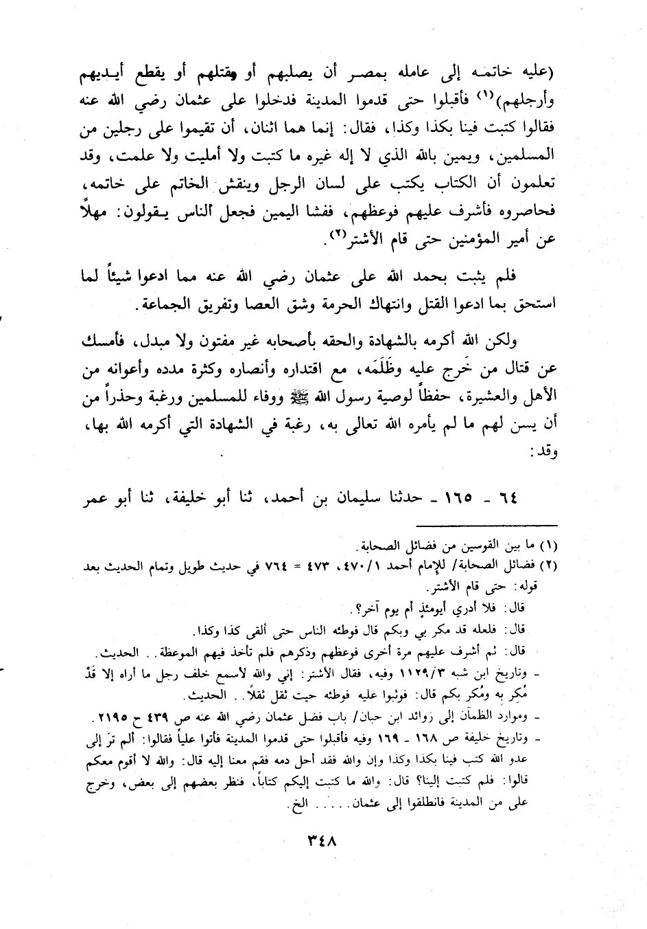 (عَلَيْهِ خَاتمه إِلَى عَامله بِمصْر أَن يصلبهم أَو يقتلهُمْ أَو يقطع أَيْديهم وأرجلهم) فَأَقْبَلُوا حَتَّى قدمُوا الْمَدِينَة فَدَخَلُوا على عُثْمَان رَضِي الله عَنهُ فَقَالُوا كتبت فِينَا بِكَذَا وَكَذَا، فَقَالَ: إِنَّمَا هما اثْنَان، أَن تُقِيمُوا على رجلَيْنِ من الْمُسلمين، وَيَمِين بِاللَّه الَّذِي لَا إِلَه غَيره مَا كتبت وَلَا أمليت وَلَا علمت، وَقد تعلمُونَ أَن الْكتاب يكْتب على لِسَان الرجل وينقش الْخَاتم على خَاتمه، فحاصروه فَأَشْرَف عَلَيْهِم فوعظهم، فَفَشَا الْيَمين فَجعل النَّاس يَقُولُونَ: مهلا عَن أَمِير الْمُؤمنِينَ حَتَّى قَامَ الأشتر.