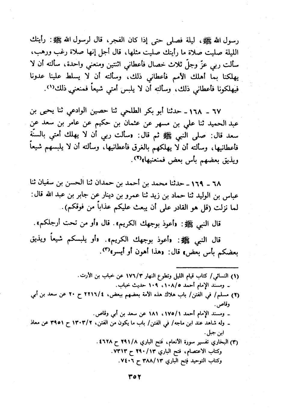 67 - 168 - حَدثنَا أَبُو بكر الطلحي ثَنَا حُصَيْن الوادعي ثَنَا يحيى بن عبد الحميد ثَنَا عَليّ بن مسْهر عَن عُثْمَان بن حَكِيم عَن عَامر بن سعد عَن سعد قَالَ: صلى النَّبِي - صَلَّى اللَّهُ عَلَيْهِ وَسَلَّم َ - ثمَّ قَالَ: " سَأَلت رَبِّي أَن لَا يهْلك أمتِي بِالسنةِ فَأَعْطَانِيهَا، وَسَأَلته أَن لَا يُهْلِكهُمْ بِالْغَرَقِ فَأَعْطَانِيهَا، وَسَأَلته أَن لَا يلْبِسهُمْ شيعًا وَيُذِيق بَعضهم بَأْس بعض فَمَنَعَنِيهَا ".
