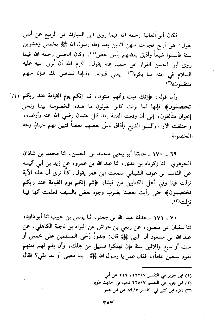 69 - 170 - حَدثنَا أَبُو يحيى مُحَمَّد بن الْحسن، ثَنَا مُحَمَّد بن شَاذان الْجَوْهَرِي: ثَنَا زَكَرِيَّا بن عدي، ثَنَا عبد الله بن عَمْرو، عَن زيد بن أبي أنيسه عَن الْقَاسِم بن عَوْف الشَّيْبَانِيّ سَمِعت ابْن عمر يَقُول: كُنَّا نرى أَن هَذِه الْآيَة نزلت فِينَا وَفِي أهل الْكِتَابَيْنِ من قبلنَا، {ثمَّ إِنَّكُم يَوْم الْقِيَامَة عِنْد ربكُم تختصمون} حَتَّى رَأَيْت بَعْضنَا يضْرب وُجُوه بعض بِالسَّيْفِ فَعلمت أَنَّهَا فِينَا نزلت.