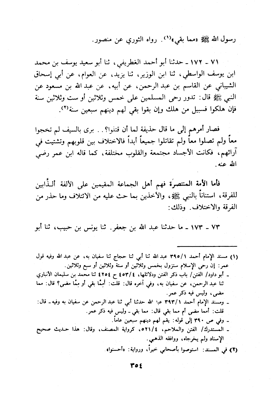 71 - 172 - حَدثنَا أَبُو أَحْمد الغطريفي، ثَنَا أَبُو سعيد يُوسُف بن مُحَمَّد ابْن يُوسُف الوَاسِطِيّ، ثَنَا ابْن الْوَزير، ثَنَا يزِيد، عَن الْعَوام، عَن أبي إِسْحَاق الشَّيْبَانِيّ عَن الْقَاسِم بن عبد الرَّحْمَن، عَن أَبِيه، عَن عبد الله بن مَسْعُود عَن النَّبِي - صَلَّى اللَّهُ عَلَيْهِ وَسَلَّم َ - قَالَ: تَدور رحى الْمُسلمين على خمس وَثَلَاثِينَ أَو سِتّ وَثَلَاثِينَ سنة فَإِن هَلَكُوا فسبيل من هلك وَإِن بقوا بَقِي لَهُم دينهم سبعين سنة.