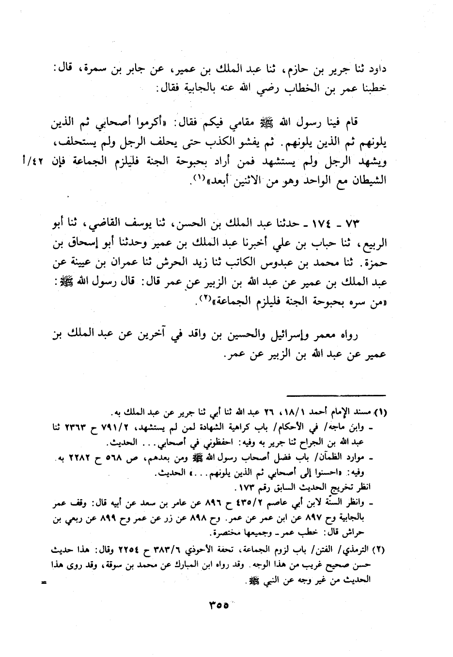 73 - 174 - حَدثنَا عبد الْملك بن الْحسن، ثَنَا يُوسُف القَاضِي، ثَنَا أَبُو الرّبيع، ثَنَا حباب بن عَليّ أخبرنَا عبد الْملك بن عُمَيْر وَحدثنَا أَبُو إِسْحَاق بن حَمْزَة. ثَنَا مُحَمَّد بن عَبدُوس الْكَاتِب ثَنَا زيد الحرش ثَنَا عمرَان بن عُيَيْنَة عَن عبد الْملك بن عُمَيْر بن عبد الله بن الزبير عَن عمر قَالَ: قَالَ رَسُول الله - صَلَّى اللَّهُ عَلَيْهِ وَسَلَّم َ -: " من سره بحبوحة الْجنَّة فليلزم الْجَمَاعَة ".