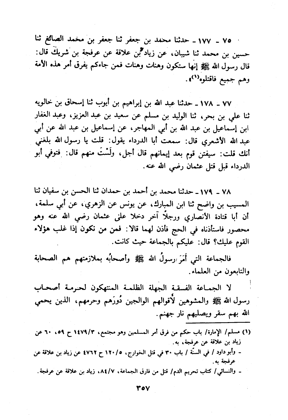75 - 177 - حَدثنَا مُحَمَّد بن جَعْفَر ثَنَا جَعْفَر بن مُحَمَّد الصَّائِغ ثَنَا حُسَيْن بن مُحَمَّد ثَنَا شَيبَان، عَن زِيَاد بن علاقَة عَن عرْفجَة بن شريك قَالَ: قَالَ رَسُول الله - صَلَّى اللَّهُ عَلَيْهِ وَسَلَّم َ - إِنَّهَا سَتَكُون وهنات وهنات فَمن جَاءَكُم يفرق أَمر هَذِه الْأمة وهم جَمِيع فَاقْتُلُوهُ ".