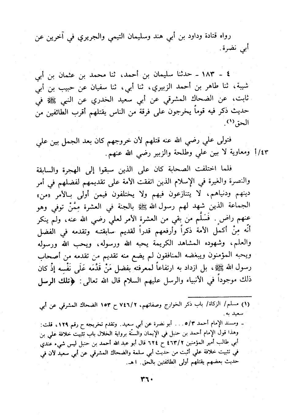4 - 183 - حَدثنَا سُلَيْمَان بن أَحْمد، ثَنَا مُحَمَّد بن عُثْمَان بن أبي شيبَة، ثَنَا طَاهِر بن أَحْمد الزبيرِي، ثَنَا أبي، ثَنَا سُفْيَان عَن حبيب بن أبي ثَابت، عَن الضَّحَّاك المشرقي عَن أبي سعيد الْخُدْرِيّ عَن النَّبِي - صَلَّى اللَّهُ عَلَيْهِ وَسَلَّم َ - فِي حَدِيث ذكر فِيهِ قوما يخرجُون على فرقة من النَّاس يقتلهُمْ أقرب الطائفين من الْحق.