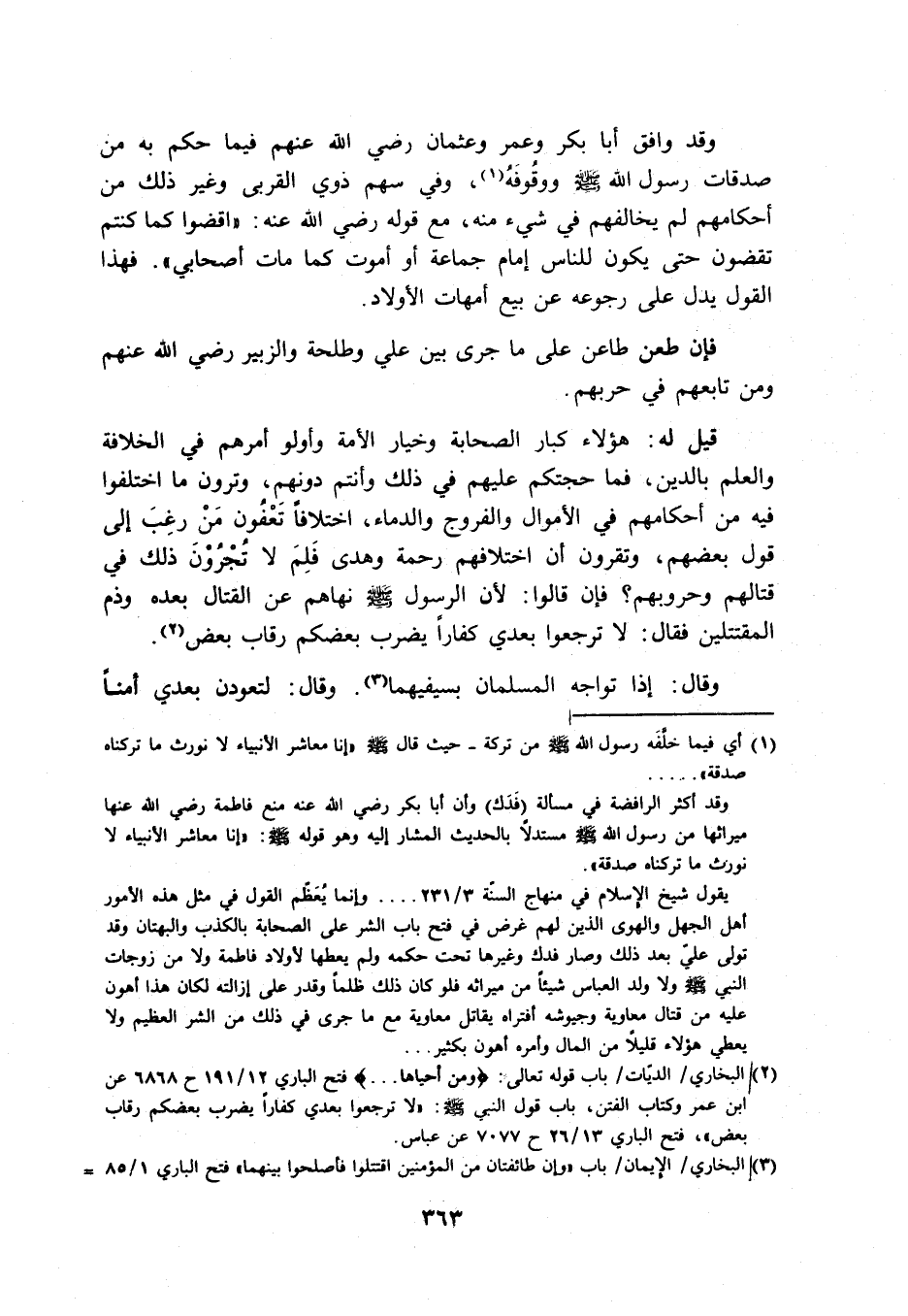 قيل لَهُ: هَؤُلَاءِ كبار الصَّحَابَة وَخيَار الْأمة وأولو أَمرهم فِي الْخلَافَة وَالْعلم بِالدّينِ، فَمَا حجتكم عَلَيْهِم فِي ذَلِك وَأَنْتُم دونهم، وترون مَا اخْتلفُوا فِيهِ من أحكامهم فِي الْأَمْوَال والفروج والدماء، اخْتِلَافا تعفون من رغب إِلَى قَول بَعضهم، وتقرون أَن اخْتلَافهمْ رَحْمَة وَهدى فَلم لَا تجرون ذَلِك فِي قِتَالهمْ وحروبهم؟ فَإِن قَالُوا: لِأَن رَسُول الله - صَلَّى اللَّهُ عَلَيْهِ وَسَلَّم َ - نَهَاهُم عَن الْقِتَال بعده وذم المقتتلين فَقَالَ: لَا ترجعوا بعدِي كفَّارًا يضْرب رِقَاب بعض.