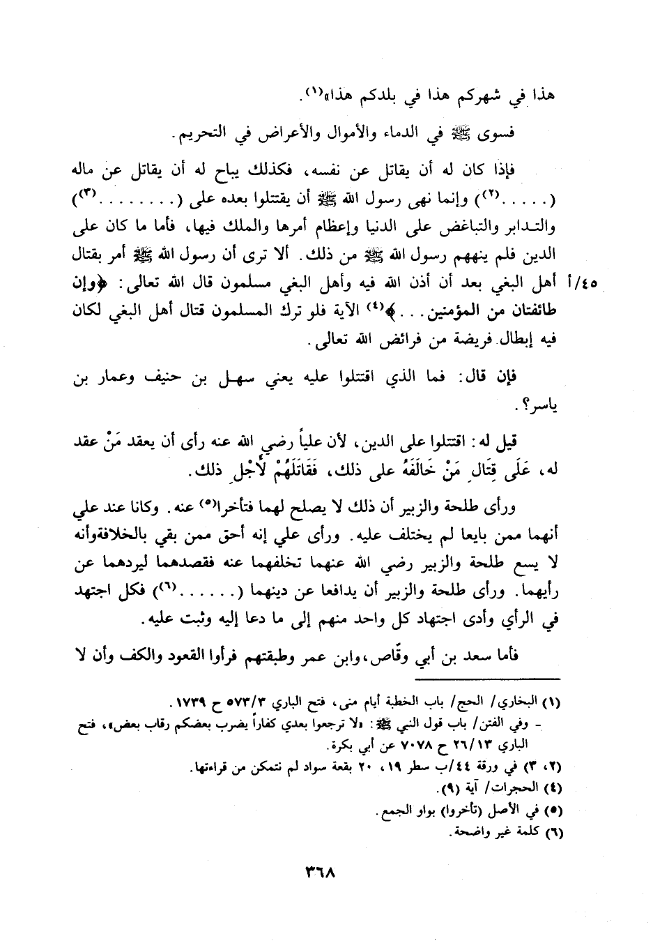 فَإِذا كَانَ لَهُ أَن يُقَاتل عَن نَفسه، فَكَذَلِك يُبَاح لَهُ أَن يُقَاتل عَن مَاله ( ... .) وَإِنَّهَا نهى رَسُول الله - صَلَّى اللَّهُ عَلَيْهِ وَسَلَّم َ - أَن يقتتلوا بعده على ( ... ... .) والتدابر والتباغض على الدُّنْيَا وإعظام أمرهَا وَالْملك فِيهَا، فَأَما مَا كَانَ على الدّين فَلم ينههم رَسُول الله - صَلَّى اللَّهُ عَلَيْهِ وَسَلَّم َ - من ذَلِك. أَلا ترى أَن رَسُول الله - صَلَّى اللَّهُ عَلَيْهِ وَسَلَّم َ - أَمر بِقِتَال أهل الْبَغي بعد أَن أذن الله فِيهِ وَأهل الْبَغي مُسلمُونَ قَالَ الله تَعَالَى: {وَإِن طَائِفَتَانِ من الْمُؤمنِينَ ... } الْآيَة فَلَو ترك الْمُسلمُونَ قتال أهل الْبَغي لَكَانَ فِيهِ إبِْطَال فَرِيضَة من فَرَائض الله تَعَالَى.