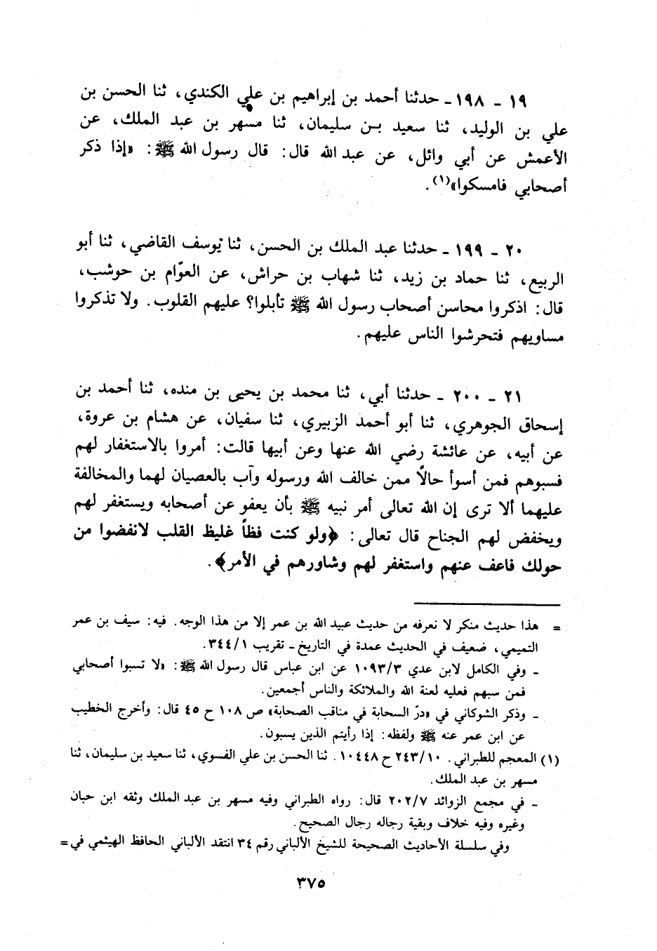 19 - 198 - حَدثنَا أَحْمد بن إِبْرَاهِيم بن عَليّ الْكِنْدِيّ، ثَنَا الْحسن بن عَليّ بن الْوَلِيد، ثَنَا سعيد بن سُلَيْمَان، ثَنَا مسْهر بن عبد الْملك، عَن الْأَعْمَش عَن أبي وَائِل، عَن عبد الله قَالَ: قَالَ رَسُول الله - صَلَّى اللَّهُ عَلَيْهِ وَسَلَّم َ -: " إِذا ذكر أَصْحَابِي فامسكوا ".