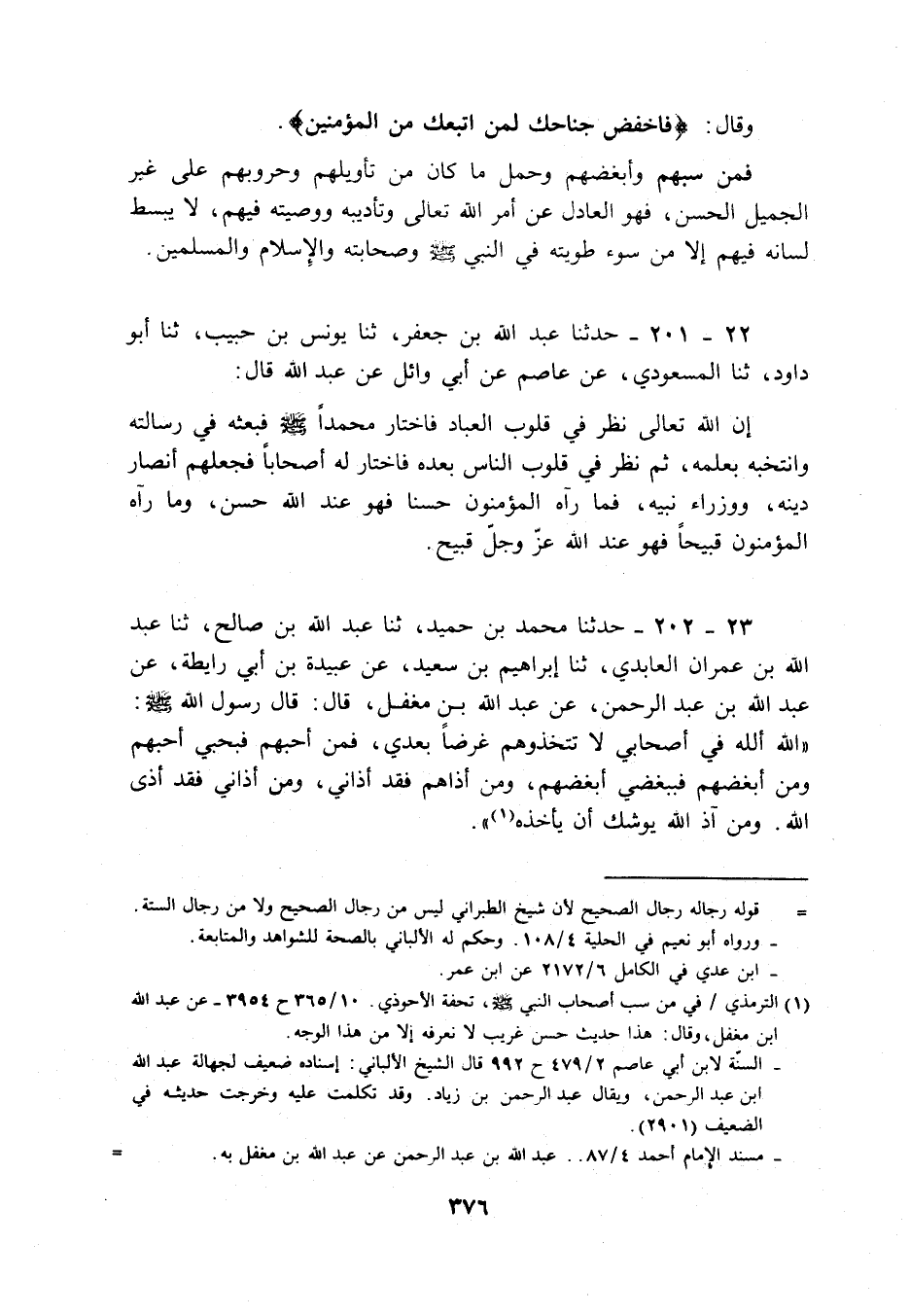 23 - 202 - حَدثنَا مُحَمَّد بن حميد، ثَنَا عبد الله بن صَالح، ثَنَا عبد الله بن عمرَان العابدي، ثَنَا إِبْرَاهِيم بن سعيد، عَن عُبَيْدَة بن أبي رايطة، عَن عبد الله بن عبد الرَّحْمَن، عَن عبد الله بن مُغفل، قَالَ: قَالَ رَسُول الله - صَلَّى اللَّهُ عَلَيْهِ وَسَلَّم َ -: " الله ألله فِي أَصْحَابِي لَا تتخذوهم غَرضا بعدِي، فَمن أحبهم فبحبي أحبهم وَمن أبْغضهُم فببغضي أبْغضهُم، وَمن أذاهم فقد أذاني، وَمن أذاني فقد أَذَى الله. وَمن آذ الله يُوشك أَن يَأْخُذهُ ".
