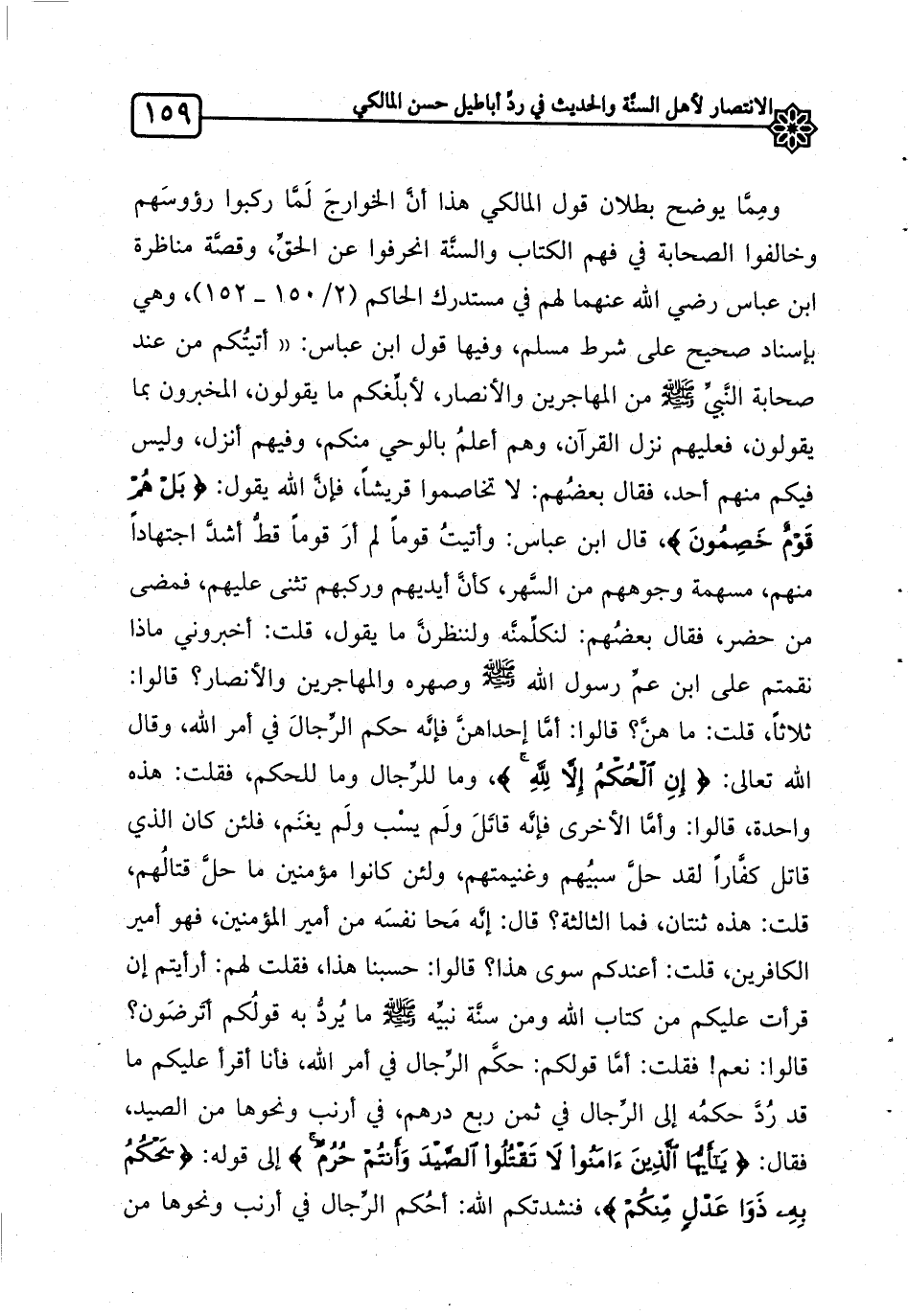 ومِمَّا يوضح بطلان قول المالكي هذا أنَّ الخوارجَ لَمَّا ركبوا رؤوسَهم وخالفوا الصحابة في فهم الكتاب والسنَّة انحرفوا عن الحقِّ، وقصَّة مناظرة ابن عباس رضي الله عنهما لهم في مستدرك الحاكم (2/150 ـ 152) ، وهي بإسناد صحيح على شرط مسلم، وفيها قول ابن عباس: "أتيتُكم من عند صحابة النَّبيِّ صلى الله عليه وسلم من المهاجرين والأنصار، لأبلِّغكم ما يقولون، المخبرون بما يقولون، فعليهم نزل القرآن، وهم أعلمُ بالوحي منكم، وفيهم أنزل، وليس فيكم منهم أحد، فقال بعضُهم: لا تخاصموا قريشاً، فإنَّ الله يقول: {بَلْ هُمْ قَوْمٌ خَصِمُونَ} ، قال ابن عباس: وأتيتُ قوماً لم أرَ قوماً قطُّ أشدَّ اجتهاداً منهم، مسهمة وجوههم من السَّهر، كأنَّ أيديهم وركبهم تثنى عليهم، فمضى من حضر، فقال بعضُهم: لنكلِّمنَّه ولننظرنَّ ما يقول، قلت: أخبروني ماذا نقمتم على ابن عمِّ رسول الله صلى الله عليه وسلم وصهره والمهاجرين والأنصار؟ قالوا: ثلاثاً، قلت: ما هنَّ؟ قالوا: أمَّا إحداهنَّ فإنَّه حكم الرِّجالَ في أمر الله، وقال الله تعالى: {إِنِ الْحُكْمُ إِلاَّ لِلَّهِ} ، وما للرِّجال وما للحكم، فقلت: هذه واحدة، قالوا: وأمَّا الأخرى فإنَّه قاتَلَ ولَم يسْب ولَم يغنَم، فلئن كان الذي قاتل كفَّاراً لقد حلَّ سبيُهم وغنيمتهم، ولئن كانوا مؤمنين ما حلَّ قتالُهم، قلت: هذه ثنتان، فما الثالثة؟ قال: إنَّه مَحا نفسَه من أمير المؤمنين، فهو أمير الكافرين، قلت: أعندكم سوى هذا؟ قالوا: حسبنا هذا، فقلت لهم: أرأيتم إن قرأت عليكم من كتاب الله ومن سنَّة نبيِّه صلى الله عليه وسلم ما يُردُّ به قولُكم أتَرضَون؟ قالوا: نعم! فقلت: أمَّا قولكم: حكَّم الرِّجال في أمر الله، فأنا أقرأ عليكم ما قد رُدَّ حكمُه إلى الرِّجال في ثمن ربع درهم، في أرنب ونحوها من الصيد، فقال: {يَا أَيُّهَا الَّذِينَ آمَنُوا لا تَقْتُلُوا الصَّيْدَ وَأَنْتُمْ حُرُمٌ} إلى قوله: {يَحْكُمُ بِهِ ذَوَا عَدْلٍ مِنْكُمْ} ، فنشدتكم الله: أحُكم الرِّجال في أرنب ونحوها من