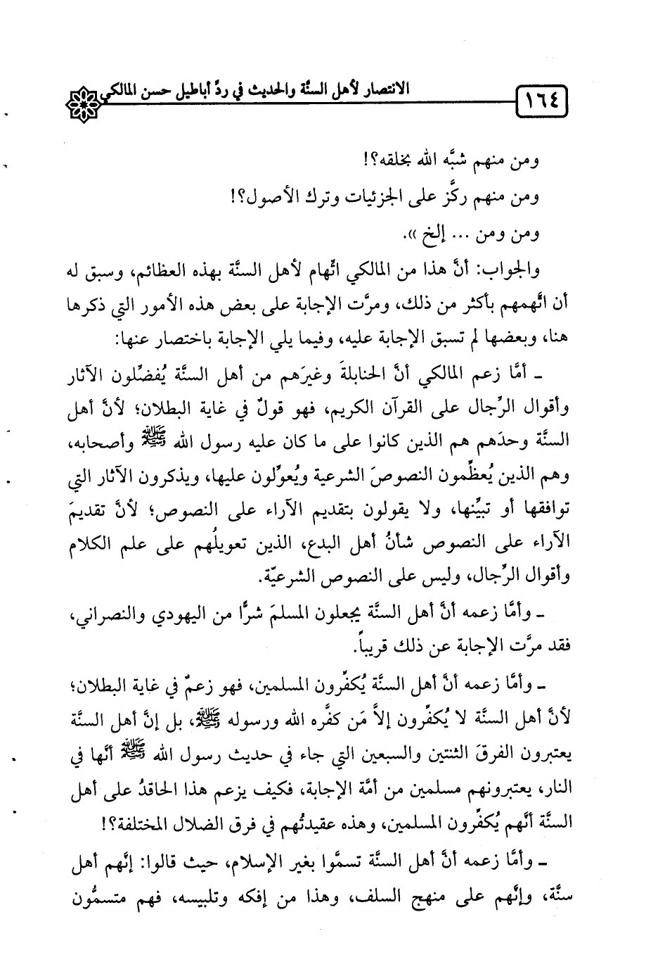ـ أمَّا زعم المالكي أنَّ الحنابلةَ وغيرَهم من أهل السنَّة يُفضِّلون الآثار وأقوال الرِّجال على القرآن الكريم، فهو قولٌ في غاية البطلان؛ لأنَّ أهل السنَّة وحدَهم هم الذين كانوا على ما كان عليه رسول الله صلى الله عليه وسلم وأصحابه، وهم الذين يُعظِّمون النصوصَ الشرعية ويُعوِّلون عليها، ويذكرون الآثار التي توافقها أو تبيِّنها، ولا يقولون بتقديم الآراء على النصوص؛ لأنَّ تقديمَ الآراء على النصوص شأنُ أهل البدع، الذين تعويلُهم على علم الكلام وأقوال الرِّجال، وليس على النصوص الشرعيّة.