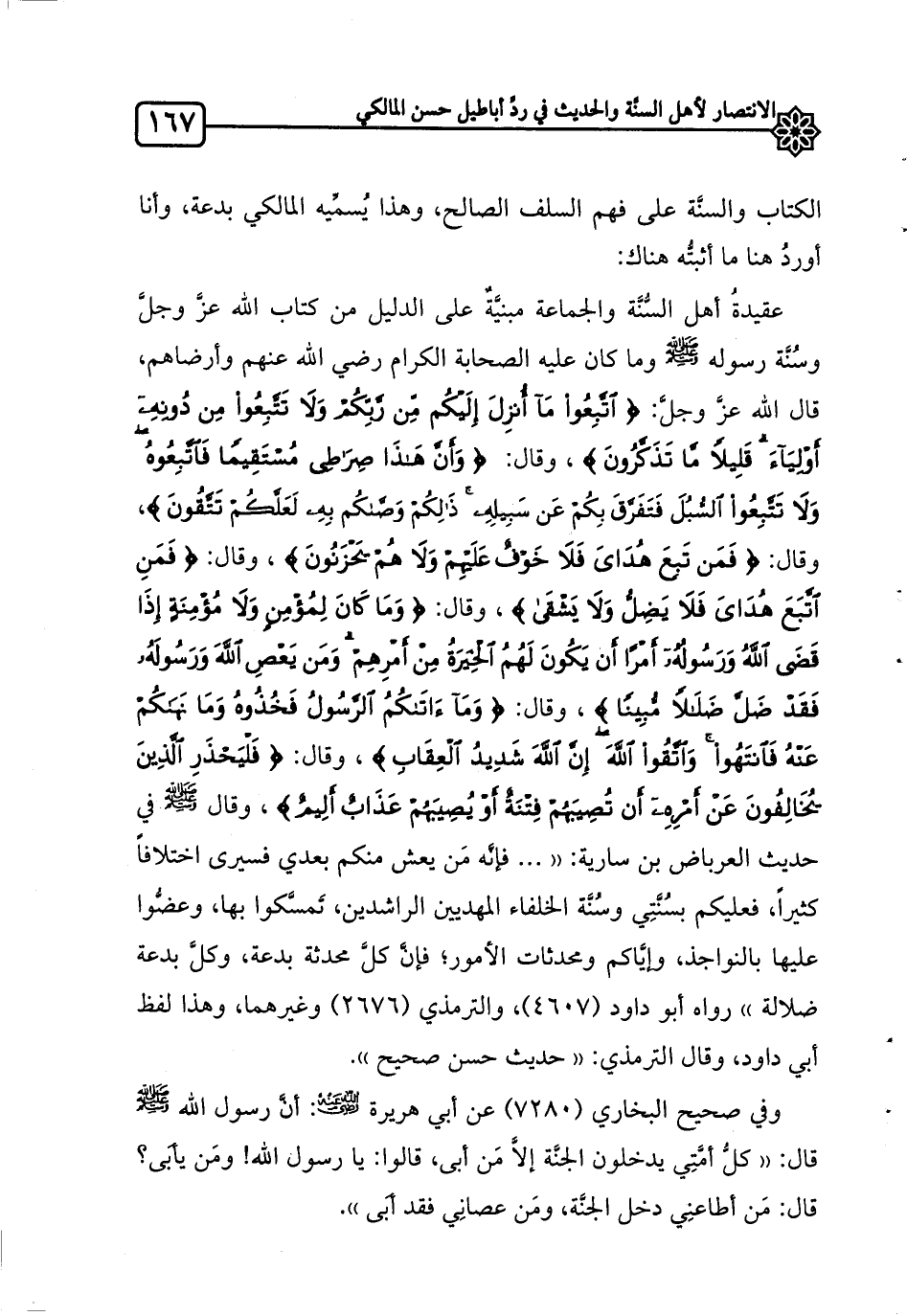 الكتاب والسنَّة على فهم السلف الصالح، وهذا يُسمِّيه المالكي بدعة، وأنا أوردُ هنا ما أثبتُّه هناك: