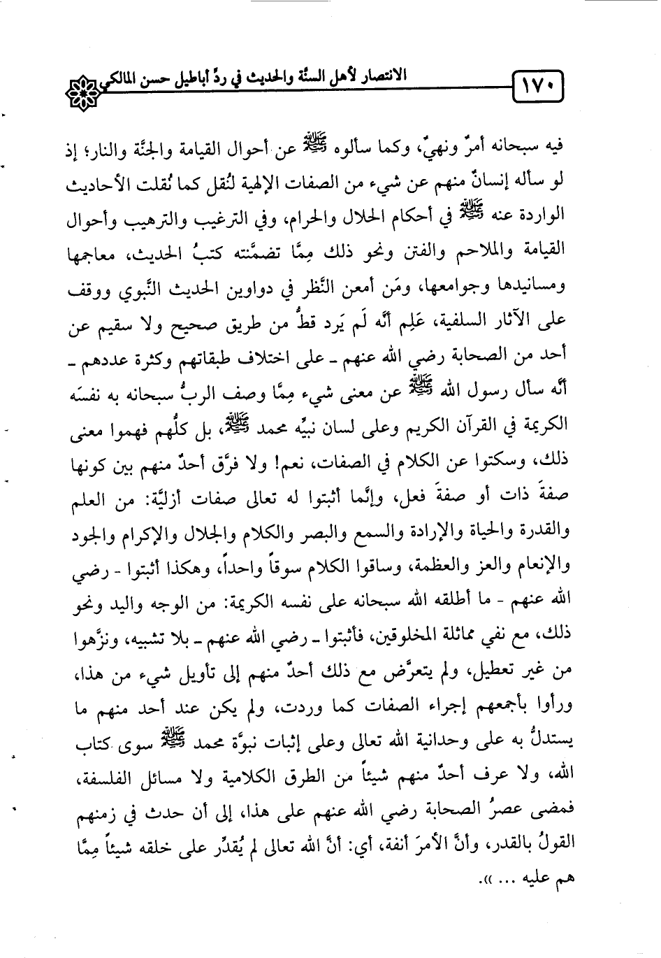 فيه سبحانه أمرٌ ونهيٌ، وكما سألوه صلى الله عليه وسلم عن أحوال القيامة والجنَّة والنار؛ إذ لو سأله إنسانٌ منهم عن شيء من الصفات الإلهية لنُقل كما نُقلت الأحاديث الواردة عنه صلى الله عليه وسلم في أحكام الحلال والحرام، وفي الترغيب والترهيب وأحوال القيامة والملاحم والفتن ونحو ذلك مِمَّا تضمَّنته كتبُ الحديث، معاجمها ومسانيدها وجوامعها، ومَن أمعن النَّظر في دواوين الحديث النَّبوي ووقف على الآثار السلفية، عَلِم أنَّه لَم يَرد قطُّ من طريق صحيح ولا سقيم عن أحد من الصحابة رضي الله عنهم ـ على اختلاف طبقاتهم وكثرة عددهم ـ أنَّه سأل رسول الله صلى الله عليه وسلم عن معنى شيء مِمَّا وصف الربُّ سبحانه به نفسَه الكريمة في القرآن الكريم وعلى لسان نبيِّه محمد صلى الله عليه وسلم، بل كلُّهم فهموا معنى ذلك، وسكتوا عن الكلام في الصفات، نعم! ولا فرَّق أحدٌ منهم بين كونها صفةَ ذات أو صفةَ فعل، وإنَّما أثبتوا له تعالى صفات أزليَّة: من العلم والقدرة والحياة والإرادة والسمع والبصر والكلام والجلال والإكرام والجود والإنعام والعز والعظمة، وساقوا الكلام سوقاً واحداً، وهكذا أثبتوا – رضي الله عنهم – ما أطلقه الله سبحانه على نفسه الكريمة: من الوجه واليد ونحو ذلك، مع نفي مماثلة المخلوقين، فأثبتوا ـ رضي الله عنهم ـ بلا تشبيه، ونزَّهوا من غير تعطيل، ولم يتعرَّض مع ذلك أحدٌ منهم إلى تأويل شيء من هذا، ورأوا بأجمعهم إجراء الصفات كما وردت، ولم يكن عند أحد منهم ما يستدلُّ به على وحدانية الله تعالى وعلى إثبات نبوَّة محمد صلى الله عليه وسلم سوى كتاب الله، ولا عرف أحدٌ منهم شيئاً من الطرق الكلامية ولا مسائل الفلسفة، فمضى عصرُ الصحابة رضي الله عنهم على هذا، إلى أن حدث في زمنهم القولُ بالقدر، وأنَّ الأمرَ أنفة، أي: أنَّ الله تعالى لم يُقدِّر على خلقه شيئاً مِمَّا هم عليه ... ".