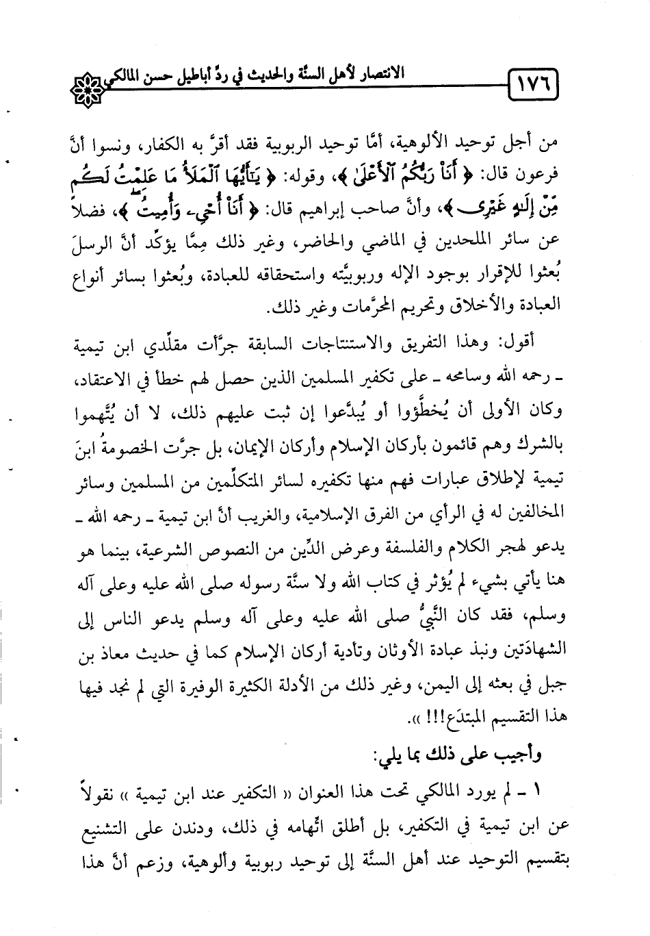 1 ـ لم يورد المالكي تحت هذا العنوان"التكفير عند ابن تيمية" نقولاً عن ابن تيمية في التكفير، بل أطلق اتِّهامه في ذلك، ودندن على التشنيع بتقسيم التوحيد عند أهل السنَّة إلى توحيد ربوبية وألوهية، وزعم أنَّ هذا