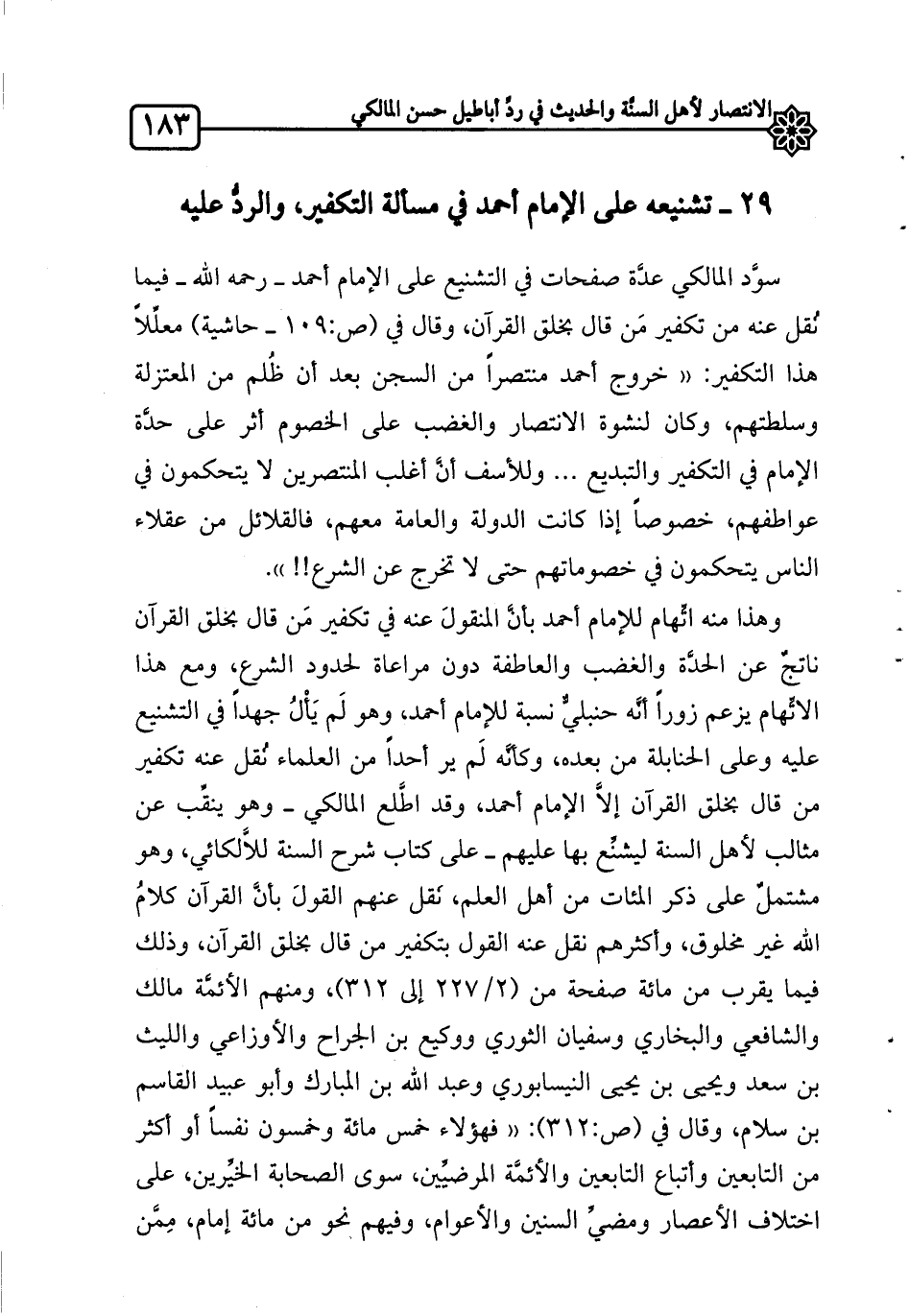وهذا منه اتِّهام للإمام أحمد بأنَّ المنقولَ عنه في تكفير مَن قال بخلق القرآن ناتجٌ عن الحدَّة والغضب والعاطفة دون مراعاة لحدود الشرع، ومع هذا الاتِّهام يزعم زوراً أنَّه حنبليٌّ نسبة للإمام أحمد، وهو لَم يَأْلُ جهداً في التشنيع عليه وعلى الحنابلة من بعده، وكأنَّه لَم ير أحداً من العلماء نُقل عنه تكفير من قال بخلق القرآن إلاَّ الإمام أحمد، وقد اطَّلع المالكي ـ وهو ينقِّب عن مثالب لأهل السنة ليشنِّع بها عليهم ـ على كتاب شرح السنة للاَّلكائي، وهو مشتملٌ على ذكر المئات من أهل العلم، نَقل عنهم القولَ بأنَّ القرآن كلامُ الله غير مخلوق، وأكثرهم نقل عنه القول بتكفير من قال بخلق القرآن، وذلك فيما يقرب من مائة صفحة من (2/227 إلى 312) ، ومنهم الأئمَّة مالك والشافعي والبخاري وسفيان الثوري ووكيع بن الجراح والأوزاعي والليث بن سعد ويحيى بن يحيى النيسابوري وعبد الله بن المبارك وأبو عبيد القاسم بن سلام، وقال في (ص: 312) : "فهؤلاء خمس مائة وخمسون نفساً أو أكثر من التابعين وأتباع التابعين والأئمَّة المرضيِّين، سوى الصحابة الخيِّرين، على اختلاف الأعصار ومضيِّ السنين والأعوام، وفيهم نحو من مائة إمام، مِمَّن