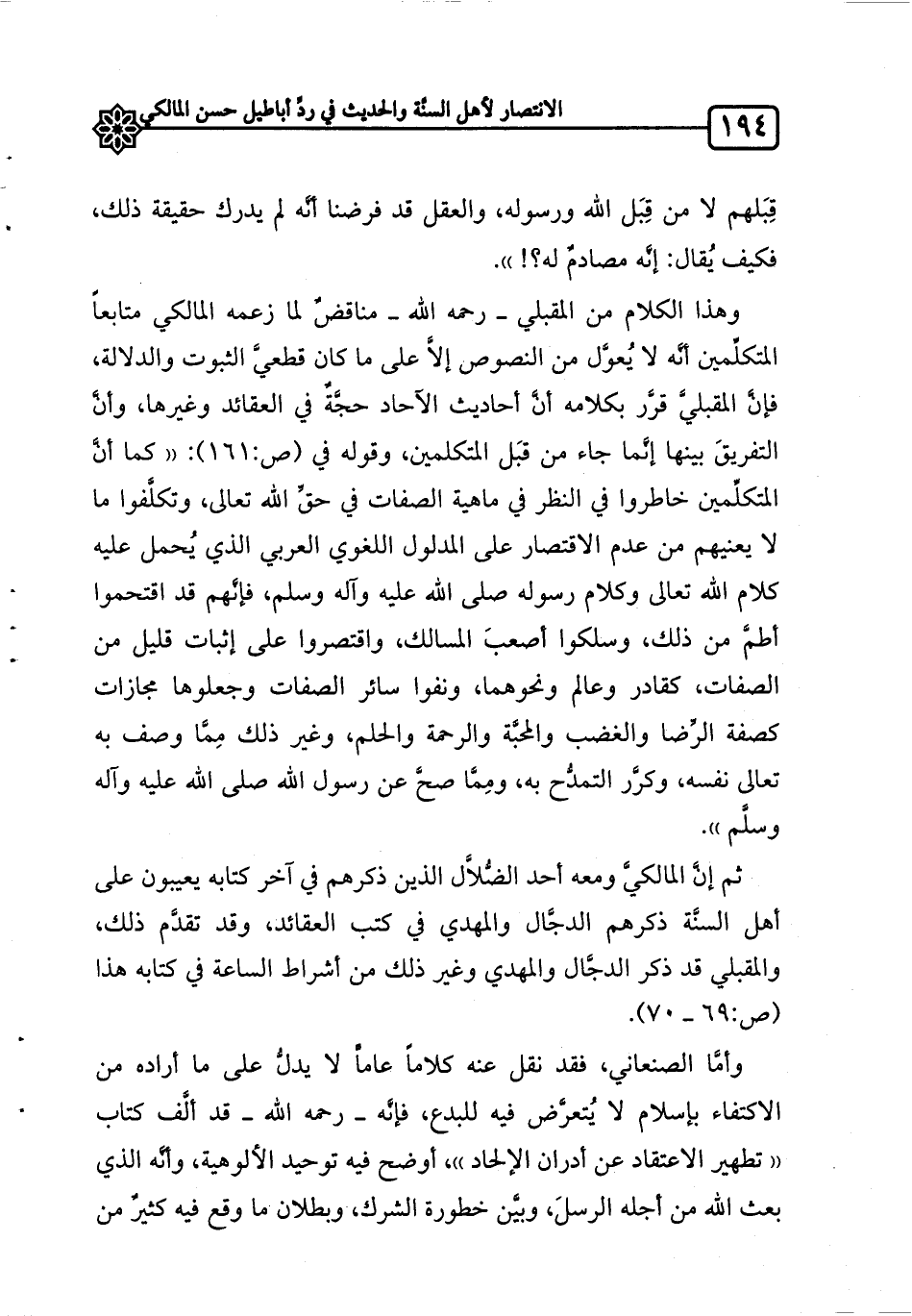 وهذا الكلام من المقبلي ـ رحمه الله ـ مناقضٌ لما زعمه المالكي متابعاً المتكلِّمين أنَّه لا يُعوَّل من النصوص إلاَّ على ما كان قطعيَّ الثبوت والدلالة، فإنَّ المقبليَّ قرَّر بكلامه أنَّ أحاديث الآحاد حجَّةٌ في العقائد وغيرها، وأنَّ التفريقَ بينها إنَّما جاء من قبَل المتكلمين، وقوله في (ص: 161) : "كما أنَّ المتكلِّمين خاطروا في النظر في ماهية الصفات في حقِّ الله تعالى، وتكلَّفوا ما لا يعنيهم من عدم الاقتصار على المدلول اللغوي العربي الذي يُحمل عليه كلام الله تعالى وكلام رسوله صلى الله عليه وآله وسلم، فإنَّهم قد اقتحموا أطمَّ من ذلك، وسلكوا أصعبَ المسالك، واقتصروا على إثبات قليل من الصفات، كقادر وعالم ونحوهما، ونفوا سائر الصفات وجعلوها مجازات كصفة الرِّضا والغضب والمحبَّة والرحمة والحلم، وغير ذلك مِمَّا وصف به تعالى نفسه، وكرَّر التمدُّح به، ومِمَّا صحَّ عن رسول الله صلى الله عليه وآله وسلَّم".