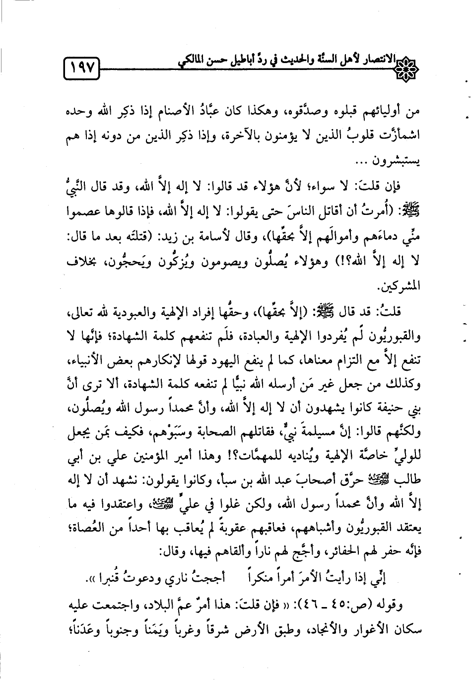 قلتُ: قد قال صلى الله عليه وسلم: (إلاَّ بحقِّها) ، وحقُّها إفراد الإلهية والعبودية لله تعالى، والقبوريُّون لًم يُفردوا الإلهية والعبادة، فلَم تنفعهم كلمة الشهادة؛ فإنَّها لا تنفع إلاَّ مع التزام معناها، كما لم ينفع اليهود قولها لإنكارهم بعض الأنبياء، وكذلك من جعل غير مَن أرسله الله نبيًّا لم تنفعه كلمة الشهادة، ألا ترى أنَّ بني حنيفة كانوا يشهدون أن لا إله إلاَّ الله، وأنَّ محمداً رسول الله ويُصلُّون، ولكنَّهم قالوا: إنَّ مسيلمةَ نبيٌّ، فقاتلهم الصحابة وسَبَوْهم، فكيف بمَن يجعل للوليِّ خاصَّة الإلهية ويُناديه للمهمَّات؟! وهذا أمير المؤمنين علي بن أبي طالب رضي الله عنه حرَّق أصحابَ عبد الله بن سبأ، وكانوا يقولون: نشهد أن لا إله إلاَّ الله وأنَّ محمداً رسول الله، ولكن غلوا في عليٍّ رضي الله عنه، واعتقدوا فيه ما يعتقد القبوريُّون وأشباههم، فعاقبهم عقوبةً لم يُعاقب بها أحداً من العُصاة؛ فإنَّه حفر لهم الحفائر، وأجَّج لهم ناراً وألقاهم فيها، وقال:
