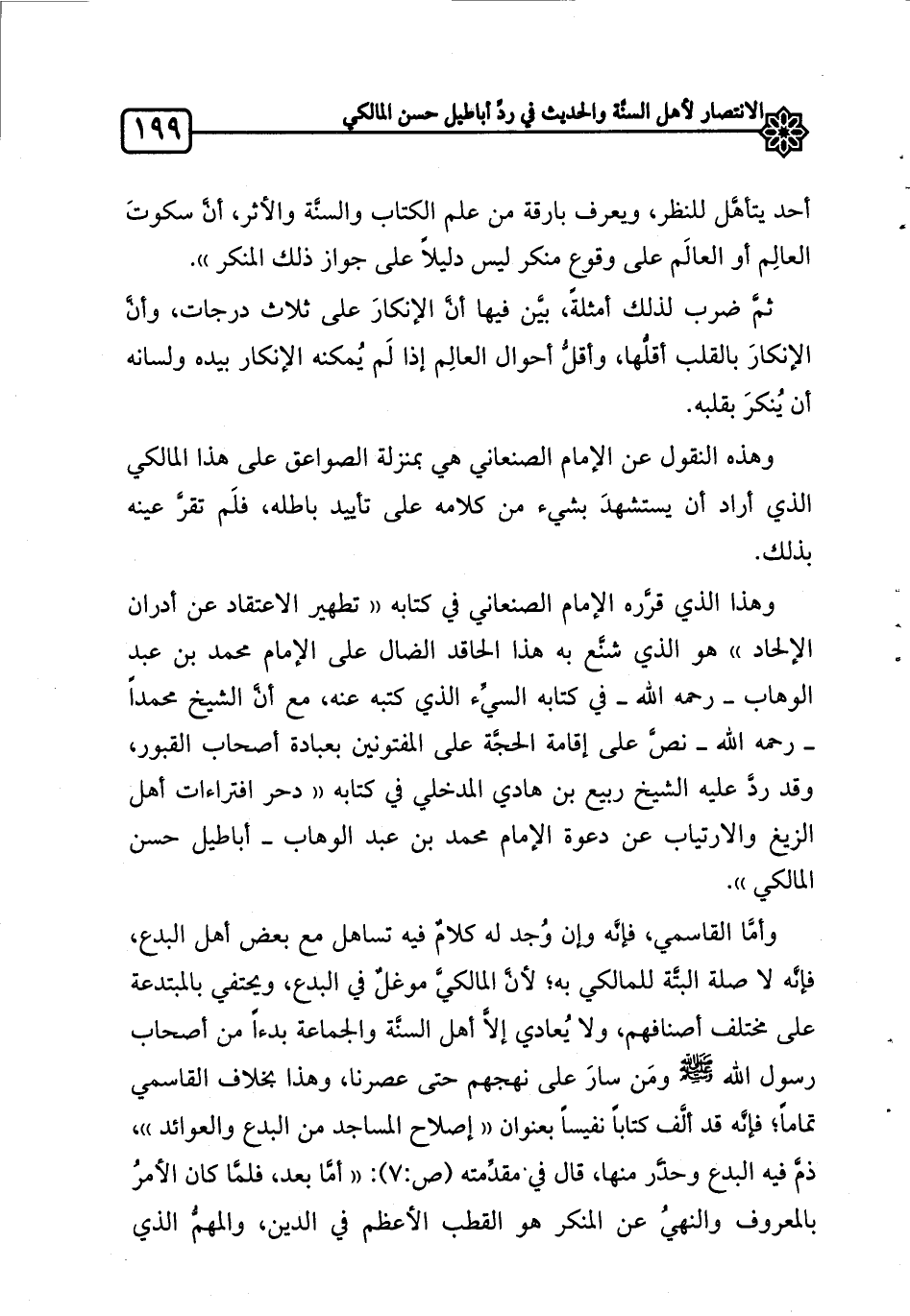 وهذا الذي قرَّره الإمام الصنعاني في كتابه"تطهير الاعتقاد عن أدران الإلحاد" هو الذي شنَّع به هذا الحاقد الضال على الإمام محمد بن عبد الوهاب ـ رحمه الله ـ في كتابه السيِّء الذي كتبه عنه، مع أنَّ الشيخ محمداً ـ رحمه الله ـ نصَّ على إقامة الحجَّة على المفتونين بعبادة أصحاب القبور، وقد ردَّ عليه الشيخ ربيع بن هادي المدخلي في كتابه"دحر افتراءات أهل الزيغ والارتياب عن دعوة الإمام محمد بن عبد الوهاب ـ أباطيل حسن المالكي".