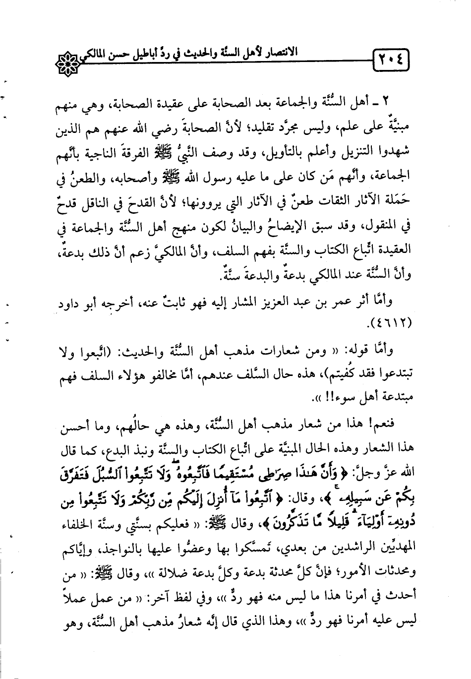 2 ـ أهل السُّنَّة والجماعة بعد الصحابة على عقيدة الصحابة، وهي منهم مبنيَّةٌ على علم، وليس مجرَّد تقليد؛ لأنَّ الصحابةَ رضي الله عنهم هم الذين شهدوا التنزيل وأعلم بالتأويل، وقد وصف النَّبيُّ صلى الله عليه وسلم الفرقةَ الناجية بأنَّهم الجماعة، وأنَّهم مَن كان على ما عليه رسول الله صلى الله عليه وسلم وأصحابه، والطعنُ في حَمَلة الآثار الثقات طعنٌ في الآثار التي يروونها؛ لأنَّ القدحَ في الناقل قدحٌ في المنقول، وقد سبق الإيضاحُ والبيانُ لكون منهج أهل السُّنَّة والجماعة في العقيدة اتِّباع الكتاب والسنَّة بفهم السلف، وأنَّ المالكيَّ زعم أنَّ ذلك بدعةٌ، وأنَّ السُّنَّة عند المالكي بدعةٌ والبدعةَ سنَّةٌ.