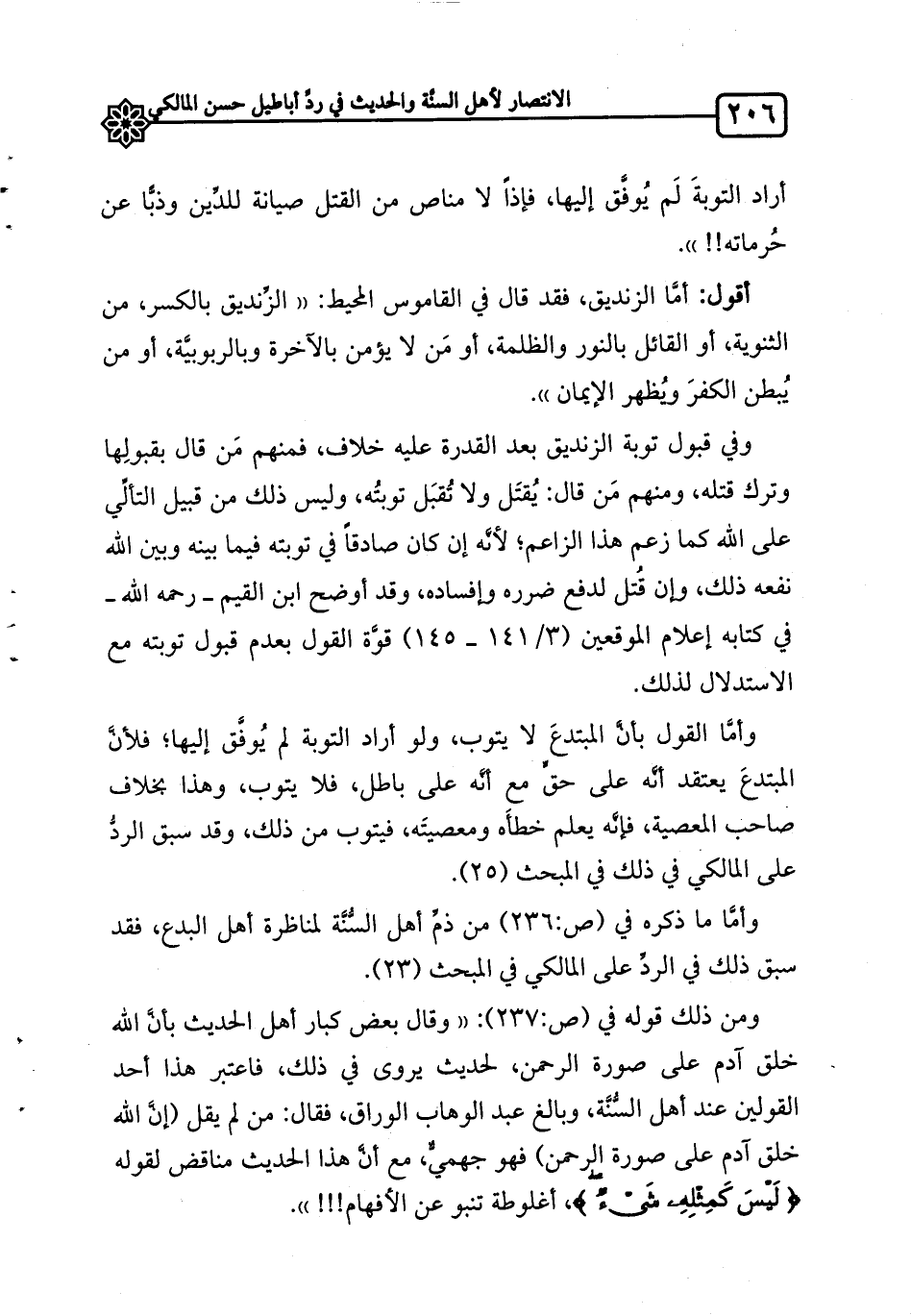 وأمَّا ما ذكره في (ص: 236) من ذمِّ أهل السُّنَّة لمناظرة أهل البدع، فقد سبق ذلك في الردِّ على المالكي في المبحث (23) .