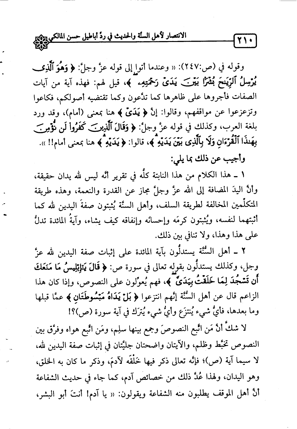 2 ـ أهل السُّنَّة يستدلُّون بآية المائدة على إثبات صفة اليدين لله عزَّ وجل، وكذلك يستدلُّون بقوله تعالى في سورة ص: {قَالَ يَا إِبْلِيسُ مَا مَنَعَكَ أَنْ تَسْجُدَ لِمَا خَلَقْتُ بِيَدَيَّ} ، فهم يُعوِّلون على النصوص، وإذا كان هذا الزاعم قال عن أهل السُّنَّة إنَّهم انتزعوا {بَلْ يَدَاهُ مَبْسُوطَتَانِ} عمَّا قبلها وما بعدها، فأيُّ شيء يُنتزَع وأيُّ شيء يُترَك في آية سورة (ص) ؟!
